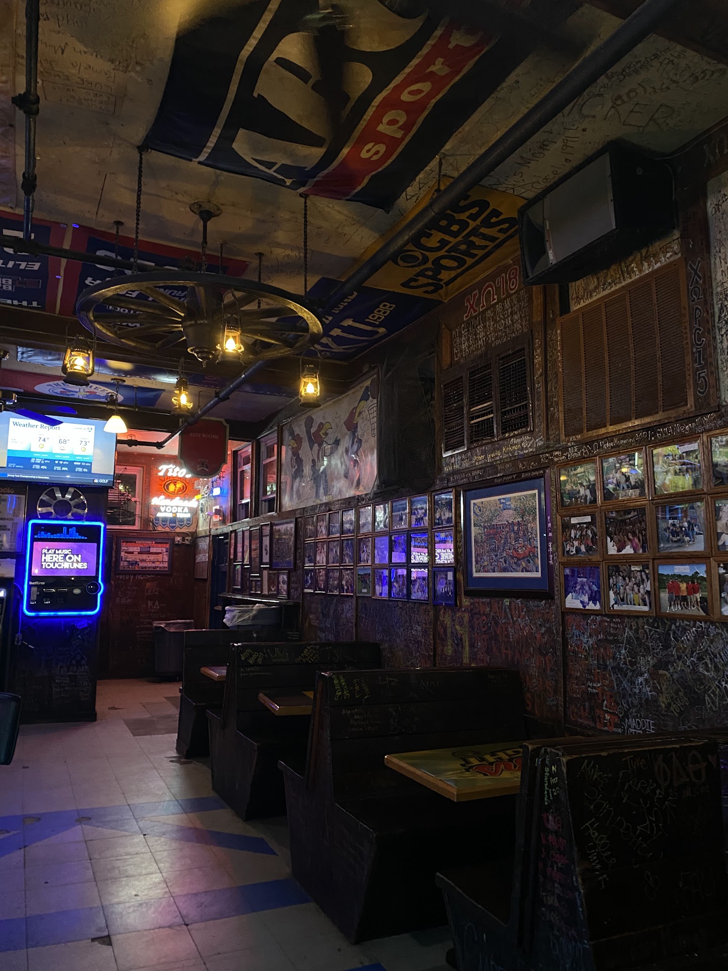 Read moreGreat college bar! Students and alumni are both regulars ! The inside is rustic with wagon wheels and flags for decor. There’s a few booths where you can sit. They also serve lunch and the veggie burger is great! Prices are fair. Make sure to bring a pen or sharpie to sign your name on the wall! Be careful when exiting the backstairs, they’re metal and sometimes get slick! (Photos are here on a Wednesday, so not...