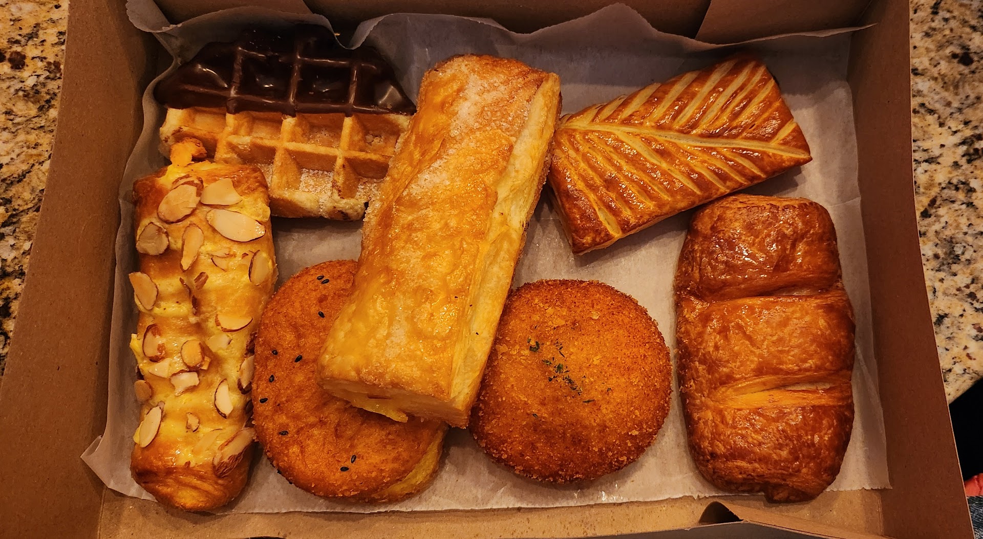 Pictured: top left clockwise - chocolate dipped waffle, Yuzu turnover, caramel apple turnover, ham & cheese croissant, kimchi croquette, curry croquette, almond...