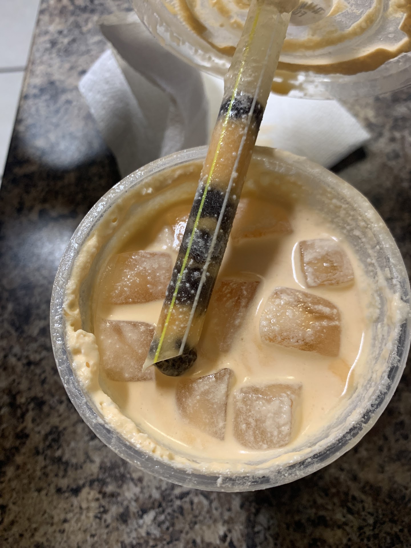 The shop also has such a cute leaf/flower wall to take pictures at! But the rest of the shop is very haphazardly decorated and they could definitely use some new colored furniture that matches the floors. Or change the floors to match the shop. Or just have some type of cohesive theme and color. The orange, green, and pink marbled floors are from the previous boba place as those colors were it’s logo colors.