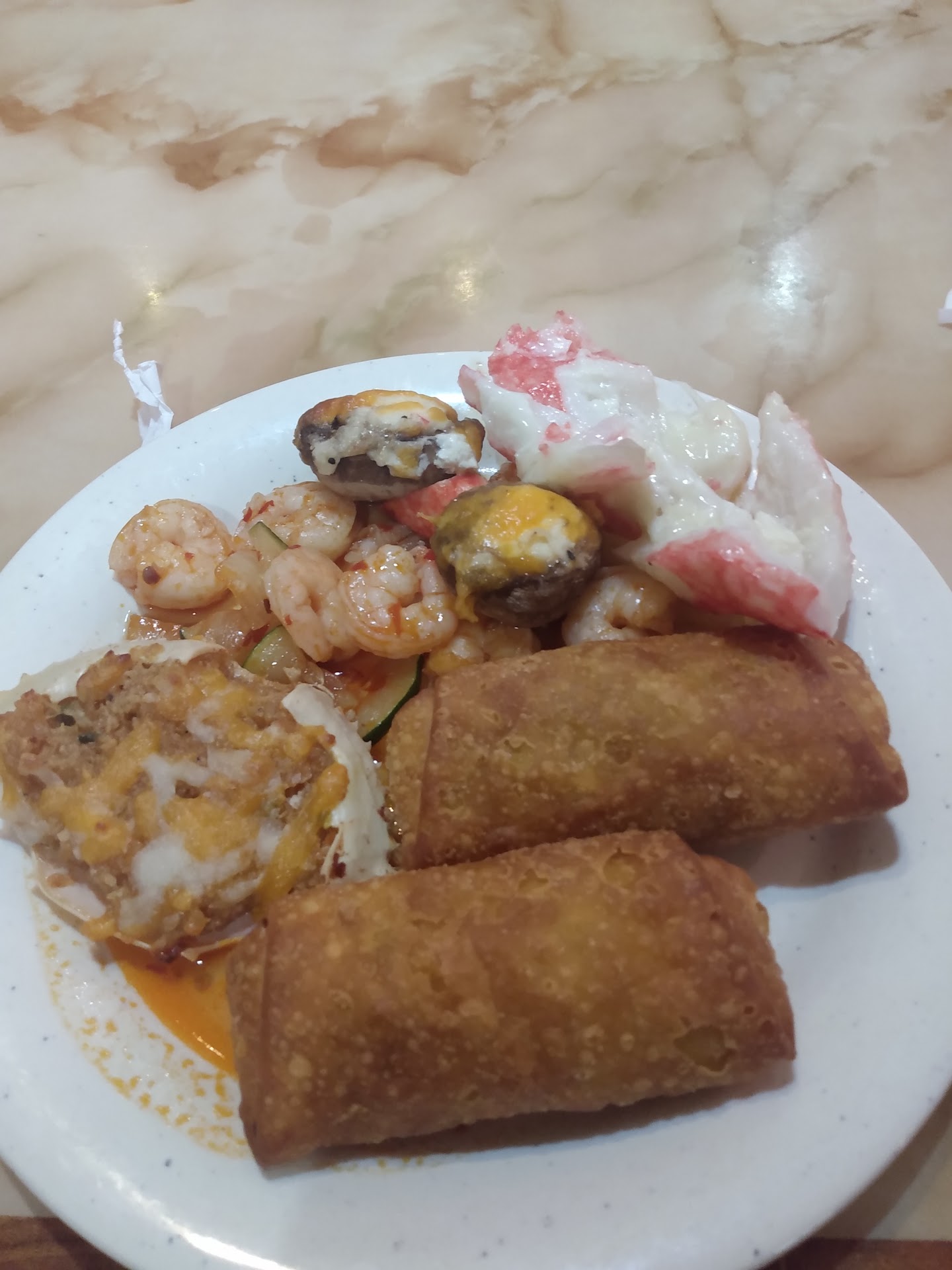 Sushi & Cold Bar: The sushi section was better than I expected for a buffet. There were at least 12 different types of rolls, from basic California rolls to more adventurous options like spicy tuna and eel avocado. Each roll was fresh and tightly rolled, and there were plenty of condiments like wasabi, ginger, and soy sauce on hand. The cold bar also had peel-and-eat shrimp, seaweed salad, and kimchi, which were nice touches.