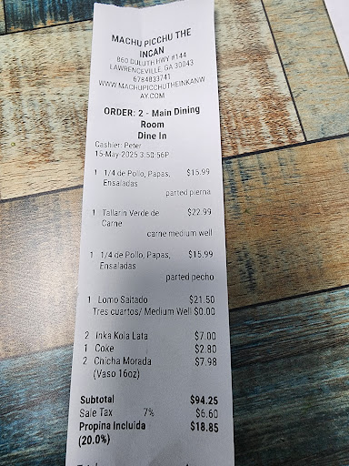 Read moreFirst, the atmosphere... a flashing OPEN sign and a llama in the front window gave way to an interior inspired by.... something... but Perú certainly does not seem to be it. A black ceiling from which hang green and yellow balloons, flooring more Mediterranean in feel, and generic tables/chairs more in line with an attempt at a rustic style coffee house. When you add in the relentless Groupo 5 videos playing, the multiple blank TV screens, and "art" appearing to be the most basic of theme attempts, the overall ambience is one of a rush to try to put something together and just open. After waiting for so long for this establishment to open, this was just the beginning of a less than spectacular experience.