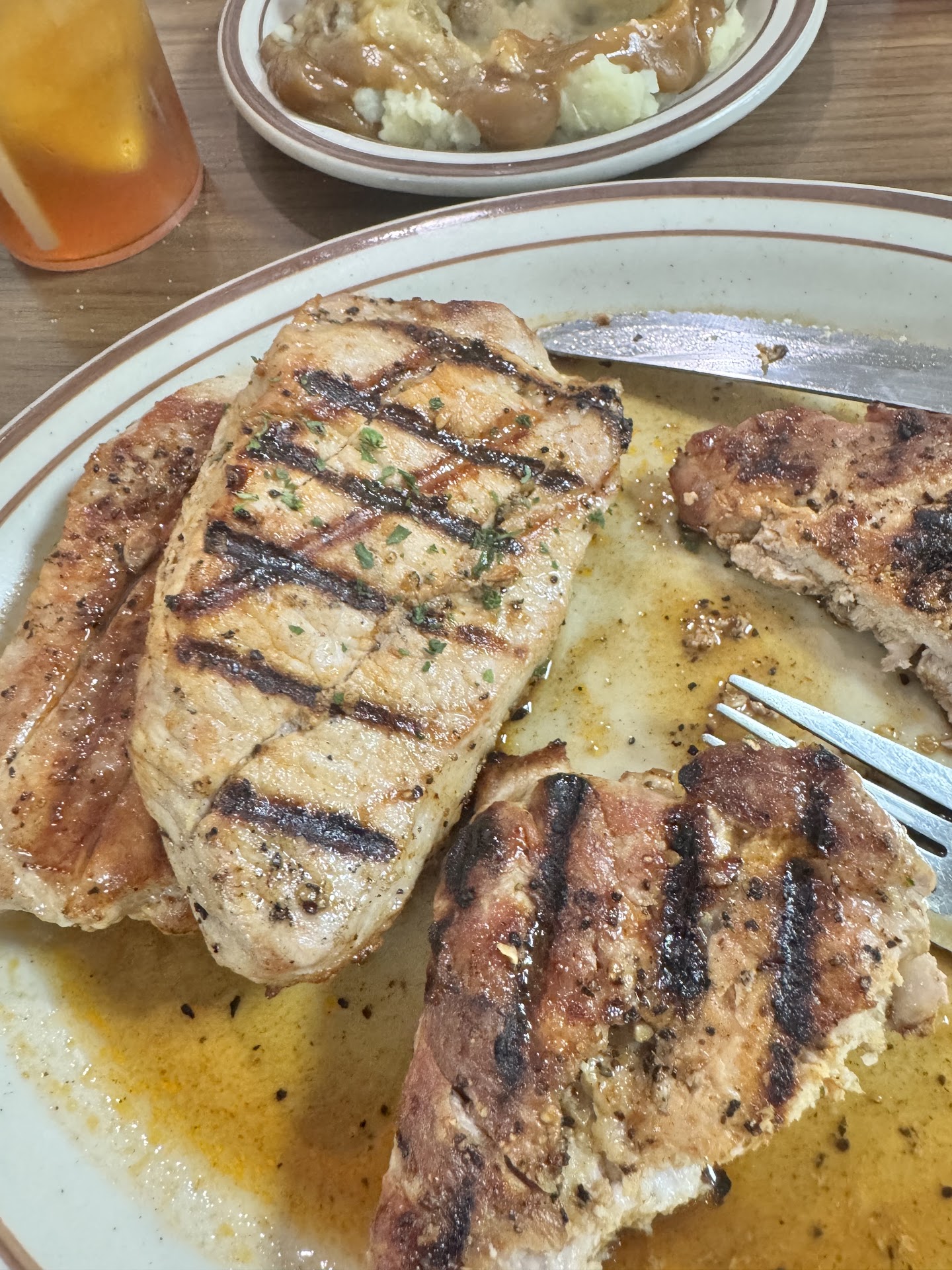 The meatloaf was obviously store bought frozen and pre-sliced through some sort of mechanical slicer. Fresh cut meatloaf shouldn't look like what I got with smooth sides. It was dense and firmed up without any pockets from the juices during the cooking process. It also had the tell tale signs of being store bought from the red "ketchup" looking layer on it. Fresh meatloaf with a ketchup topping doesn't look like it's been frozen into the top of the loaf and flattened to it either. This is probably why they smothered it in brown gravy, which tasted like prepackaged instant gravy and was very thick like it had been sitting in a pot too long waiting to get used. It wasn't even mixed well because I could taste pockets of added salt in the gravy.