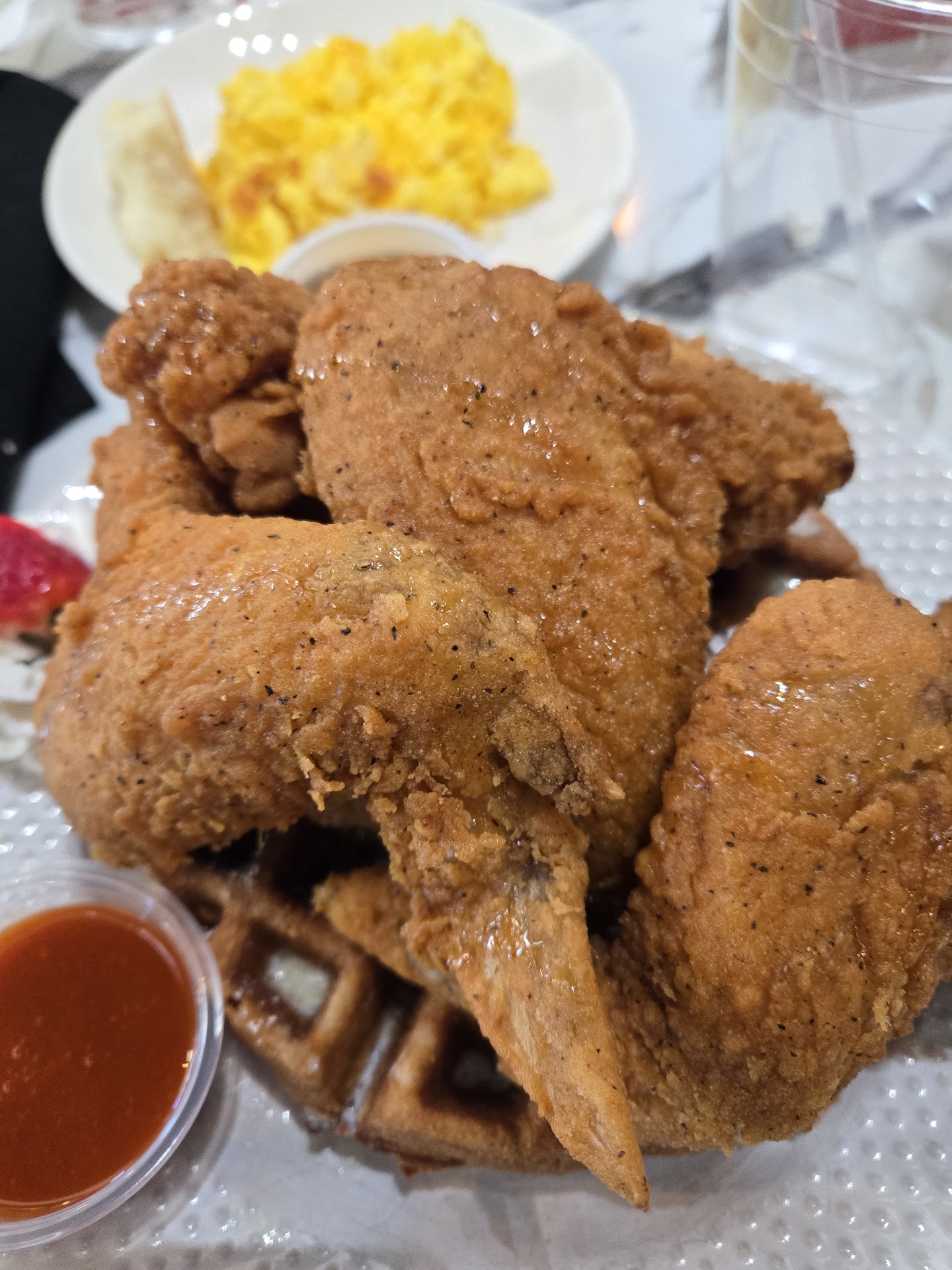 Now, let's break down my plate: When I say the chiken was good, I mean good! The batter was delectible, fried to perfection (crunchy skin but hot, juicy meat falling off the bone). The honey drizzle was the perfect compliment on top of my waffle. I LOVE CARROT CAKE and this waffle did not disappoint. It was perfectly crunchy on the outside and wonderfully soft into the bite. The eggs were cooked "chefs choice" and I'm so grateful I did. They came perfectly scrambled. Not too hard, not too soft.