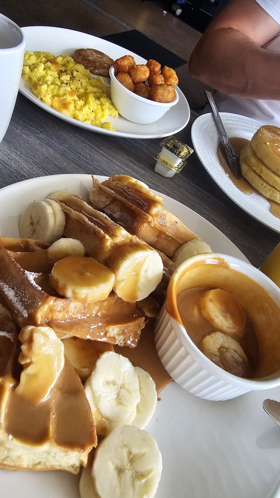 Nicely located in a plaza with a newer ambiance. Quickly seated by friendly staff. The coffee is subpar as expected but came out very hot with a bowl of fixed flavor creamers. We ordered the dulce de leches waffles with "smoked chicken" and the pancake breakfast platter. We waited 45 minutes for our food to come out. I could tell they were avoiding us because they were behind in the kitchen. My waffles were room temperature and they forgot my chicken. The pancakes were nothing exquisite. The waitress came back to ask if everything came out alright and then she asked what meat I ordered and she went to get it. There was nothing "smoked" about the chicken. It was obvious they forgot the chicken and they grilled the chicken quickly to get it out to me. The flavor of the chicken was great but I was already halfway through my waffles by that time.