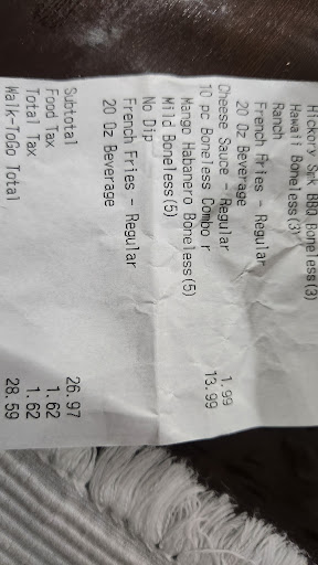 Read moreI wasn’t going to leave a review but I really think either management or corporate has to work on time & workers attitude. I have been here only two times & both have been bad. If food is going to be taking 20-30 more for it to be ready from our pick up time , that should be taken into consideration & pick up time should be given way later , so people aren’t upset for sitting and waiting so long. Being there , there was a Hispanic person asking me for help to translate how much longer the food would take , which I told her how to say it , but she said it improperly & a worker rudely said HUH? So she said it again but in Spanish. Now being that she’s doing this for DD or Uber eats , she didn’t want to get bad remarks for taking to long with the food , so I can underStand her being annoyed for being there 20+ for an order. It’s a shame to see such a pretty young lady have such a nasty & ugly attitude. She went on & on about how she shouldn’t be complaining because it’s not her food & that she didn’t think she would want uncooked chicken & then she had the audacity to yell out “you’re in America , speak English” that’s what ticked me off. She really needs to find some enlightenment so she can not be so angry & rude. Stop being so hateful to people & you will live a happier &...