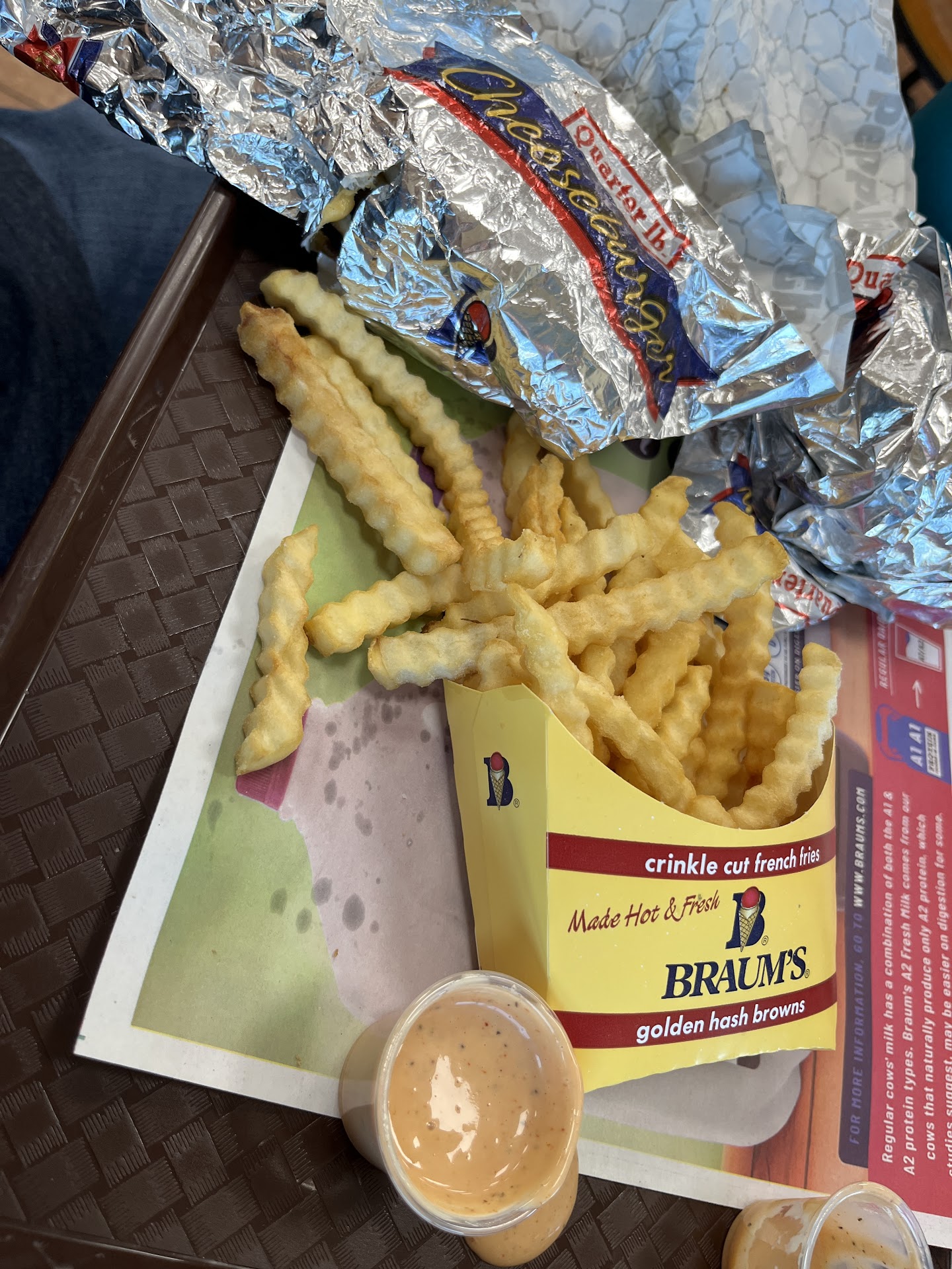 I never in my life thought there would be a better burger than In N outs Double Doubles. Until today⦠I came in very skeptical because i have spoken to multiple Oklahomans who have called Braumās āSOLIDā. This place has absolutely PHENOMENAL FOOD! The very first thing i tried was their Braumās sauce which had an exquisite flavor similar to Canes sauce but lighter and it had a spicy undertone too it that did not overwhelm the tongue. As soon as i bit into the burger i was immediately taken back by the flavor. It reminded me of a homemade burger your dad would make for you as a kid at a cookout in the summer or on a special occasion. Absolute nostalgia and pride in being an American. Small town burger but made big waves on my taste buds. The fries were nothing short of perfect, crispy, freshly made to order and the perfect amount of salt. I also had a spicy chicken sandwich that tasted like a gas station sandwich in the BEST WAY. The chicken was fresh, perfectly seasoned and fried to perfection the entire thing provided a flavor that overwhelmed the senses and made me sink in my seat. To top my visit off i noticed they had mexican flavors of ice cream i thought was really cool. I had the PiƱon flavored ice cream that paired perfectly with my meal. This place is definitely a 5/5!