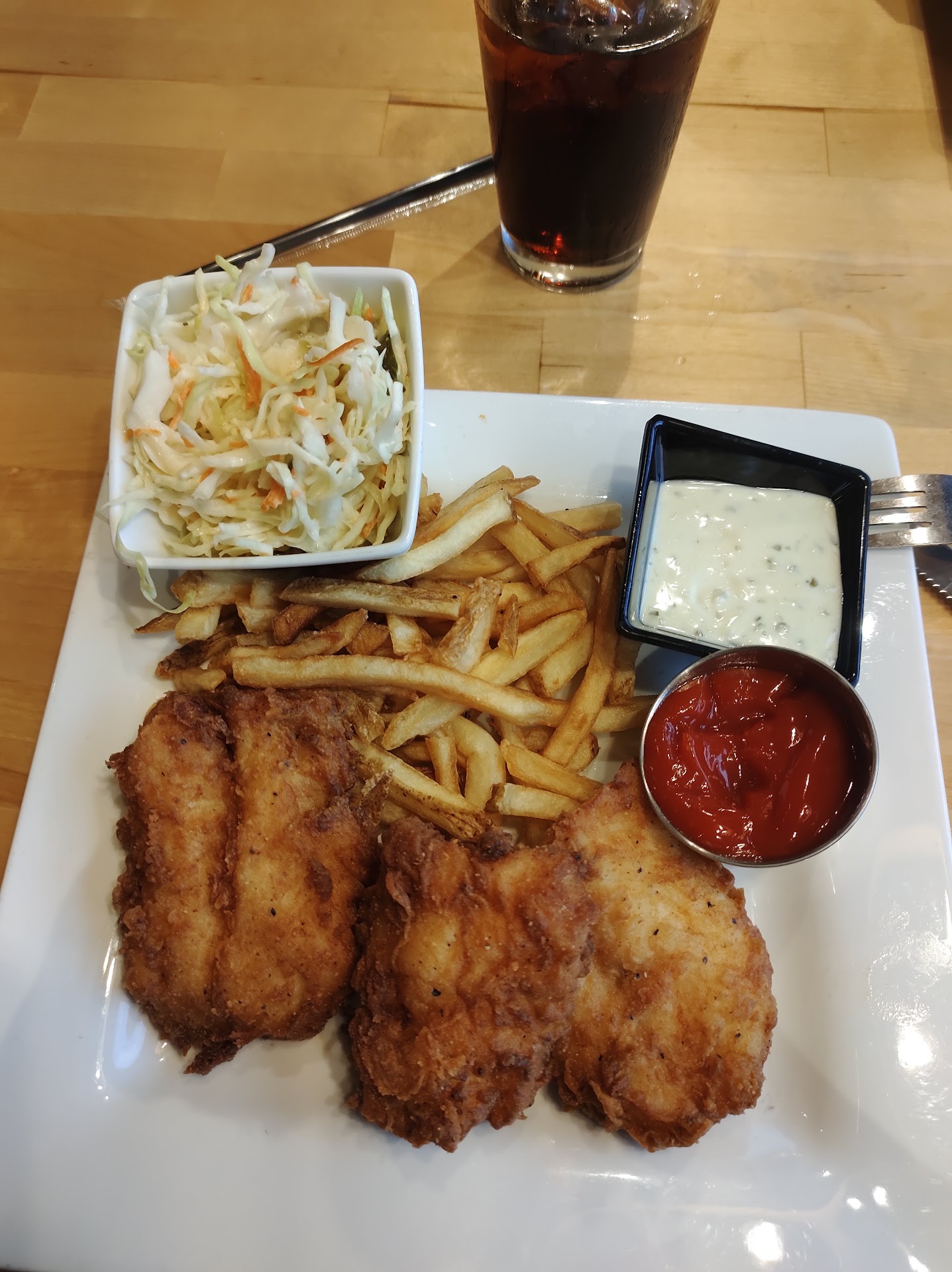 My chips (fries) were limp and soggy, not crisp like they're supposed to be. The slaw was bland. Though it was lightly dressed, it lacked flavor and needed some acid. Especially since the fish was so greasy. I was looking for some acid like vinegar or lemon to get some relief from the fat. All I could taste was cabbage. My slaw had several pieces of sliced cabbage core, not appealing at all.
