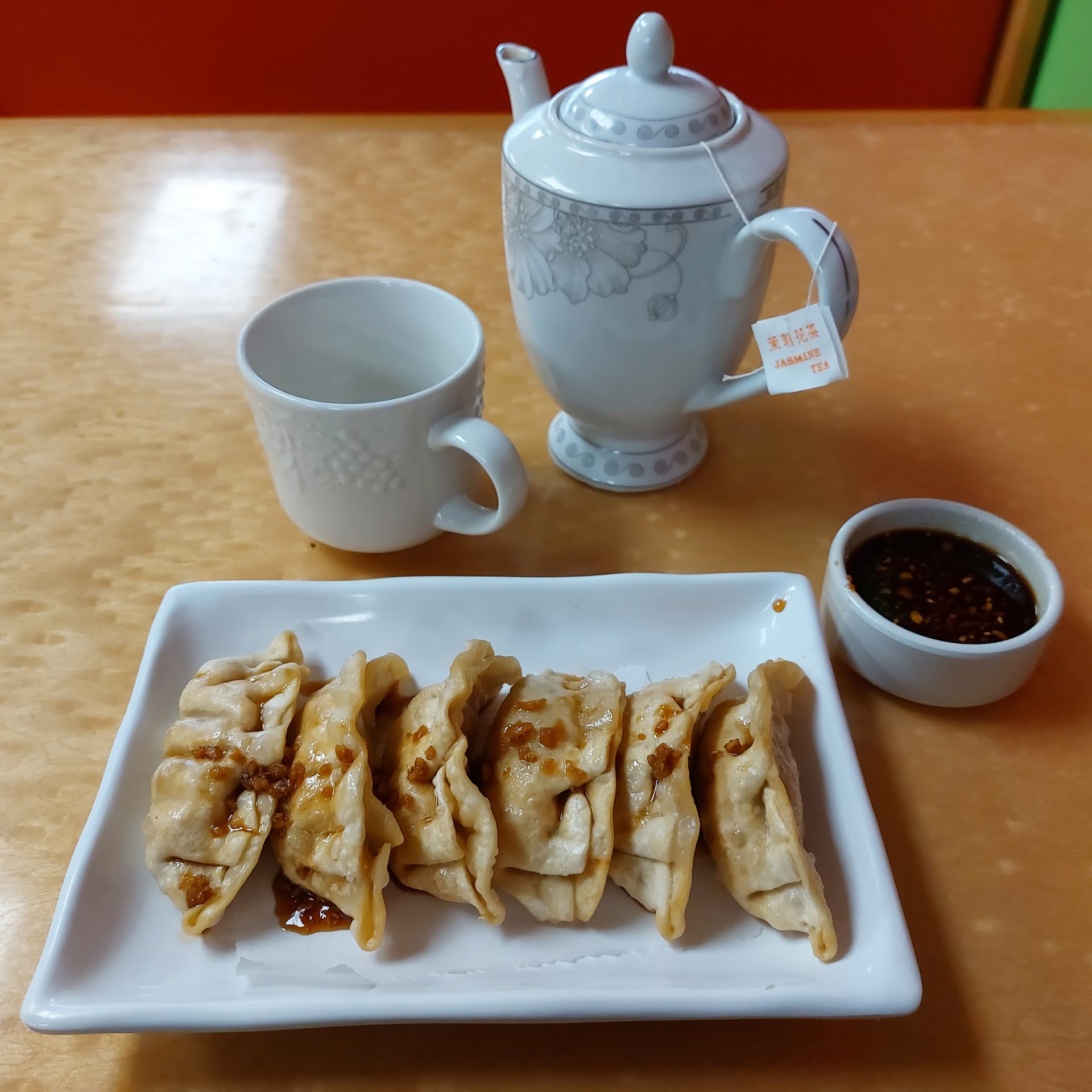 I ordered potstickers, because I hadn't yet eaten and needed something quickly. They brought out my Jasmine tea in a lovely pot with a china cup. I continued perusing the menu, there were so many things I wanted to try! But there were also many dishes I recognized that were accompanied by mouth-watering photographs.