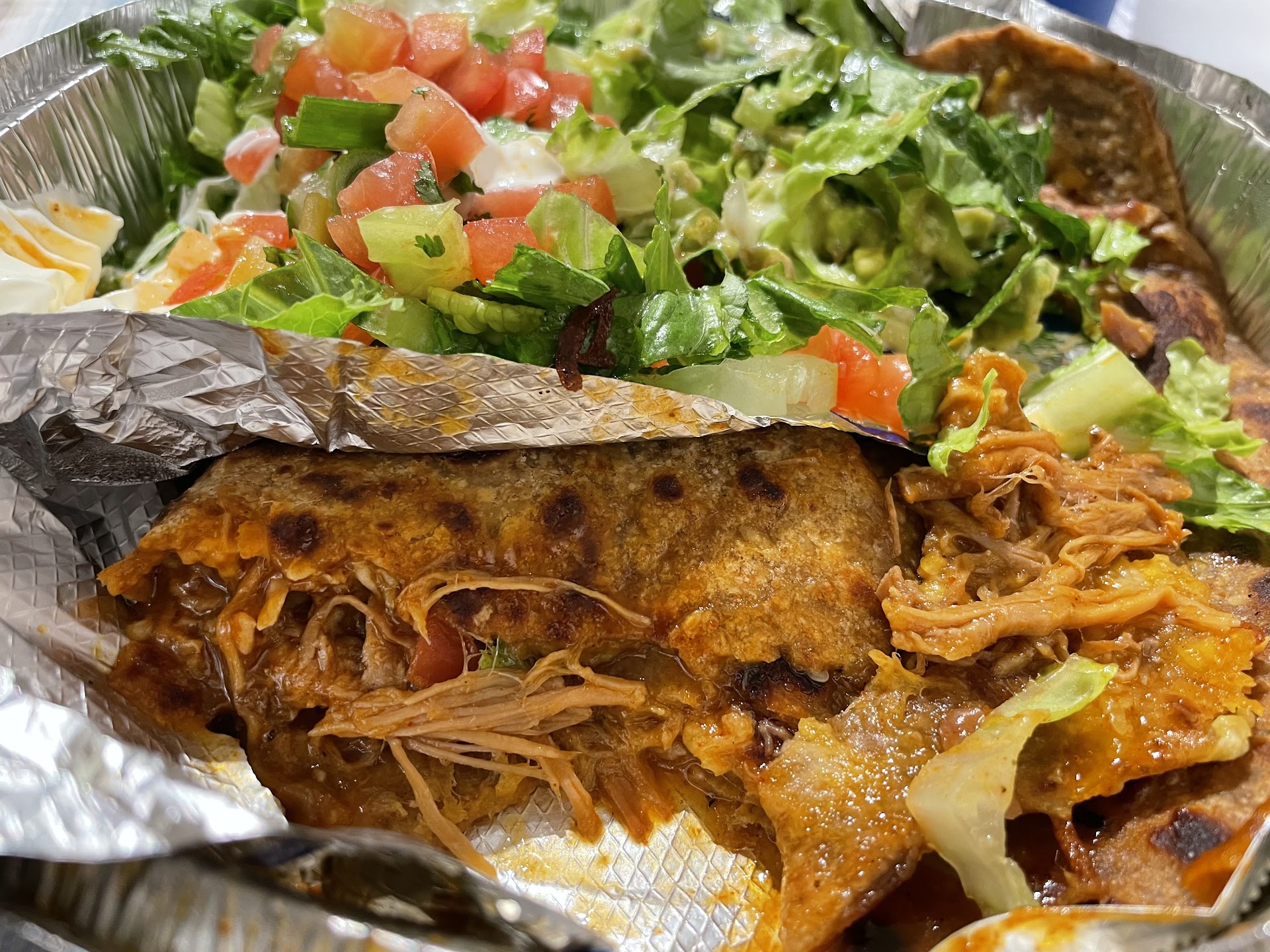 Delicious! We had this for our Christmas Eve dinner. I had the sweet pork quesadilla on a wheat tortilla, my boyfriend had the sweet pork burrito smothered in sauce (with habanero sauce on the side), my oldest had the chicken salad, and my youngest had the chicken quesadilla.