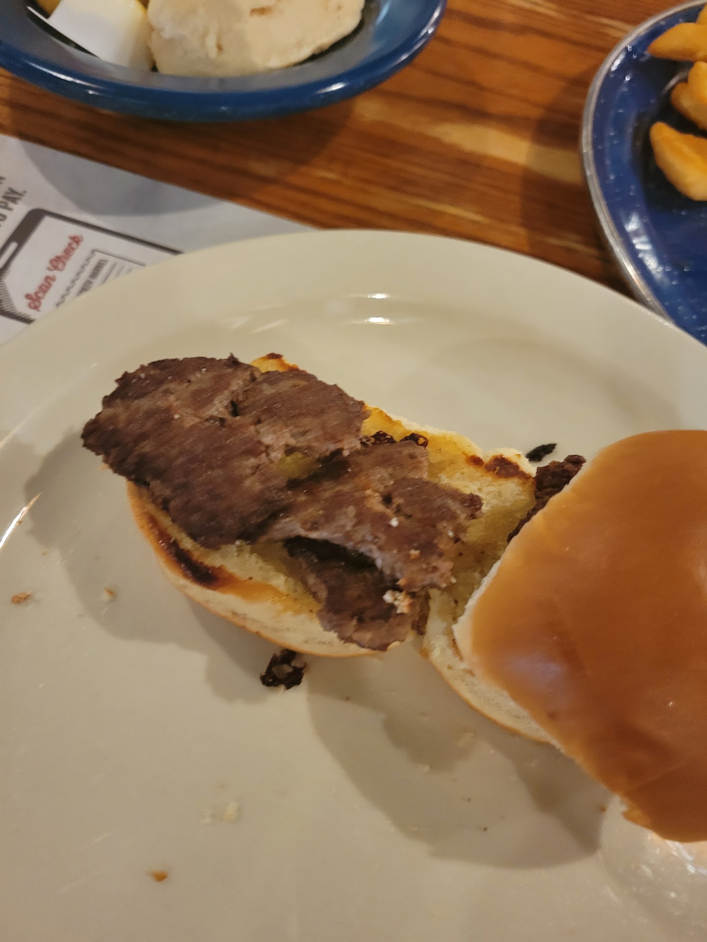 Read moreThis Cracker Barrel really seems to be hit or miss. I've had some good meals here, I've also had some bad ones. However, I've never been really upset until my most recent visit. I decided I would take my 7 year old here for dinner. I didn't feel like cooking that evening, and wanted a calm sit down meal so we could talk and relax. To begin with, I ordered a side salad that my son and I shared. Before we got even halfway through with it they brought our meals. This was irritating. Now we have to hurry and eat before our food gets cold. I don't come to a restaurant to be rushed, and it's something I see a lot of places these days. But that's not what made me angry. My son ordered the burger sliders with no cheese. When his meal arrived the burgers had cheese on them. No biggie, we sent it back, more time for him to eat his cucumbers and Lettuce. But then they brought the replacement burgers. They looked horrible. One patty was tiny and burnt, the other wasn't even a patty, it was chopped into 3 separate pieces. And burnt. I looked at the server and said "really?" Like you're comfortable serving this to my child? He just shrugged his shoulders and said "I guess they just cooked them that way this time." I mean I opened the burgers and showed him. It literally looked like the cook was irritated he had to cook them again, so he grabbed some overcooked burger pieces off the floor and put them on a bun. There is one thing that will make me angry at a restaurant, and that's putting badly cooked food in front of my child. It took a lot of self control for me to not walk back to the kitchen and confront the cook myself. If you are making food for a child you better make sure you do a good job and handle with care. Anything less is negligent and insulting. But we ate, or tried to eat. In the end neither of us finished. His food just wasn't appetizing. And when I started eating my mashed potatoes I realized they actually tasted sweet. Like somebody put sugar or honey in them. Gross. The manager wasn't available, so the shift manager handled my complaint. She was professional and apologetic, refunded the cost of my son's meal. Honestly, I don't like complaining at a restaurant. It was a waste of money, a waste of time. We basically went home and I made him another dinner. After this experience I seriously doubt I will be...