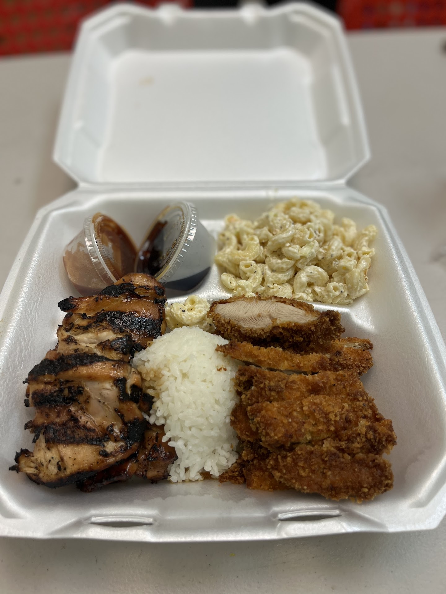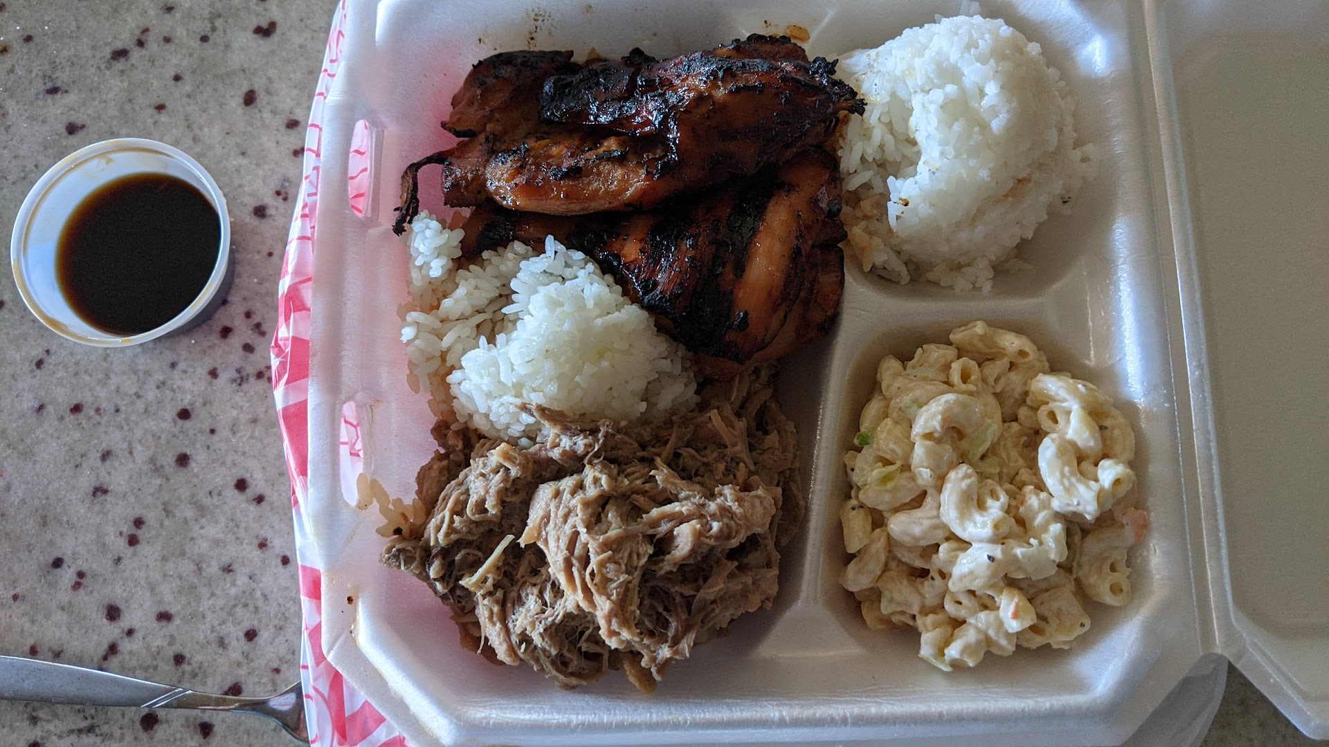 Read moreThis is a small family run place that has a simple menu and is very friendly. The pulehu chicken is very good and so far our favorite meat option. We ordered the regular combo that came with two meats, two scoops rice, and mac salad. Rice was good and sticky. Mac salad was not something we normally like and still do not like as this tastes about like the others. The kalua pig was moist but the sauce it came with was too salty for me which made eating the pig alone a little bland. You do get a decent amount of food with your order and I will go back to try some of their other dishes as well. I liked this place and is worth a try to compare to the other Hawaiian style places...