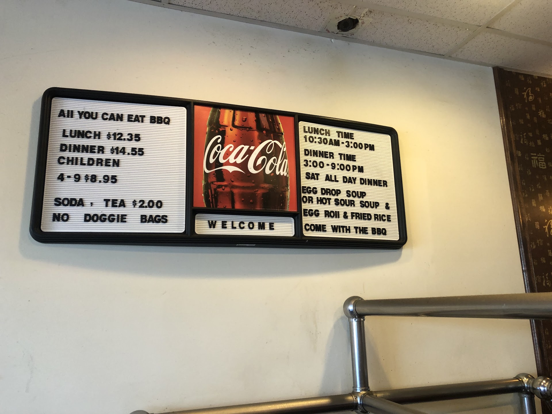 The all you can eat price is very reasonable (come hungry), and you get some basic fried rice, 1 egg roll per person, and some kind of soup. Drink selection is lacking however, especially if you want diet soda (diet coke only). No wifi is offered, and a basic dining area with comfortable booths. Very much WYSIWYG.