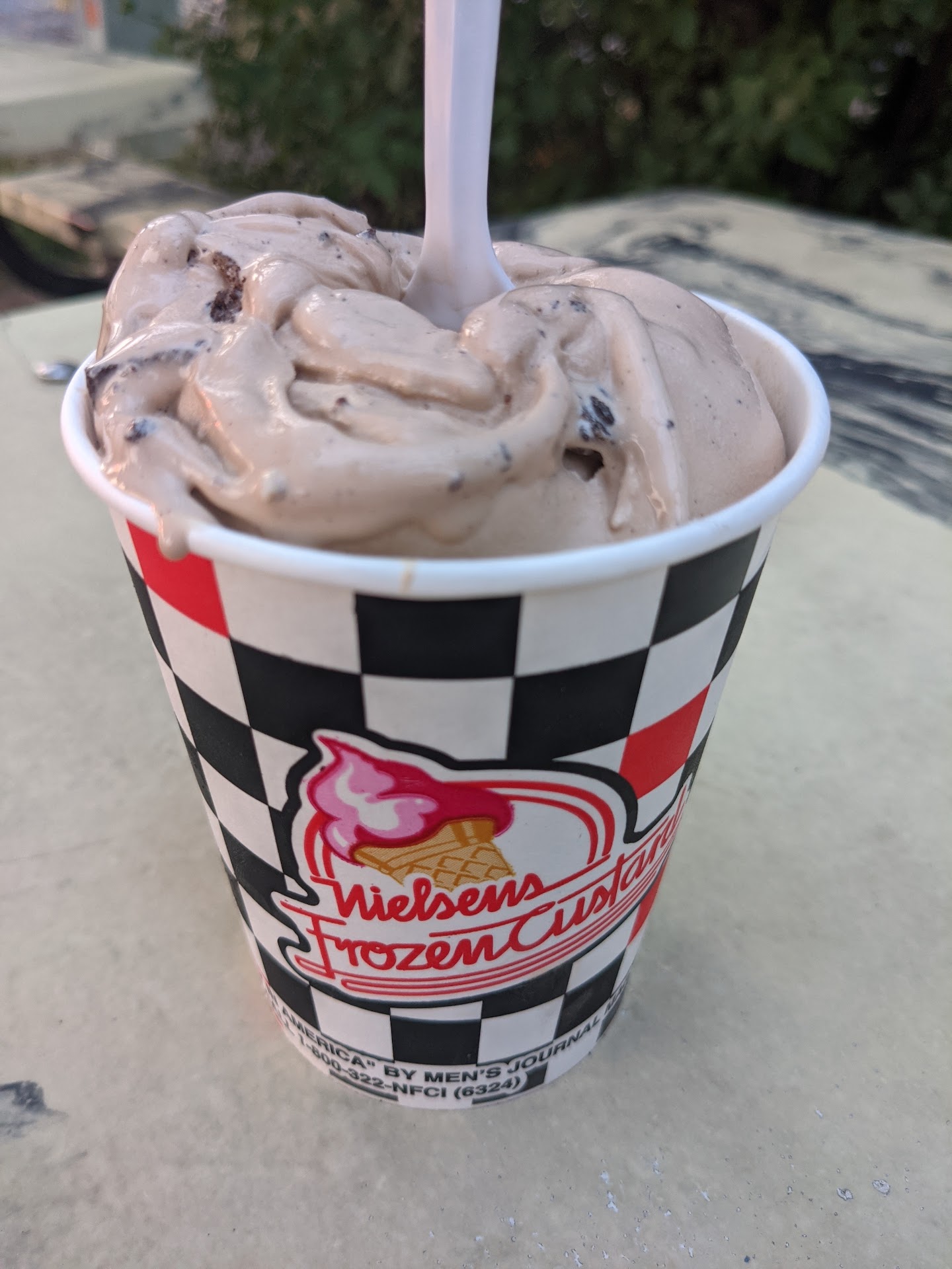 Read moreMy 1st visit did not disappoint. I ordered my chocolate custard with snickers and pecans. It was so creamy and thick.. .. .. just the way I like my frozen treats. I went with my husband and two other couples. We arrived about 8:15 on a Saturday night. I think we got there in between crowds. Watching the customers walk in, families with birthdays to celebrate, others just enjoying their time spent together, it was clear to me that frozen custard was a treat for ALL ages. I know Nielsen's also makes French fries, but I was so focused on all the add-ins I could put in my custard that I didn't pay attention to anything else on the menu board. I know they make fries because a member of our group ordered some. A bit pricey for the size you get when ordering the "Concrete " ... translation...super creamy, thick, firm frozen custard in vanilla or chocolate with stuff you can add-in (for an additional price of abt $0.99 per add-in, if I remember correctly). The first add-in is included in the price. My husband and I spent about $12 between us. We both had a Concrete with 2 add ins. It's not the price so much as the size of the cup that can surprise you. Not meaning to make waves here but, if you are imagining say an ummm treat from somewhere like, oh I don't know, the "Ibg, for instance, you'll need to readjust that image in your head ⬇️⬇️. Yes, it is smaller. By how many ounces I cannot say. The bright 🌞 side is .. .. you're gonna love it, you're gonna want to take your mother-in-law there. (maybe she'll buy!) Your gonna wanna take some home (quarts & pints avail).. .. .. and, you're gonna wanna go back again and again and...
