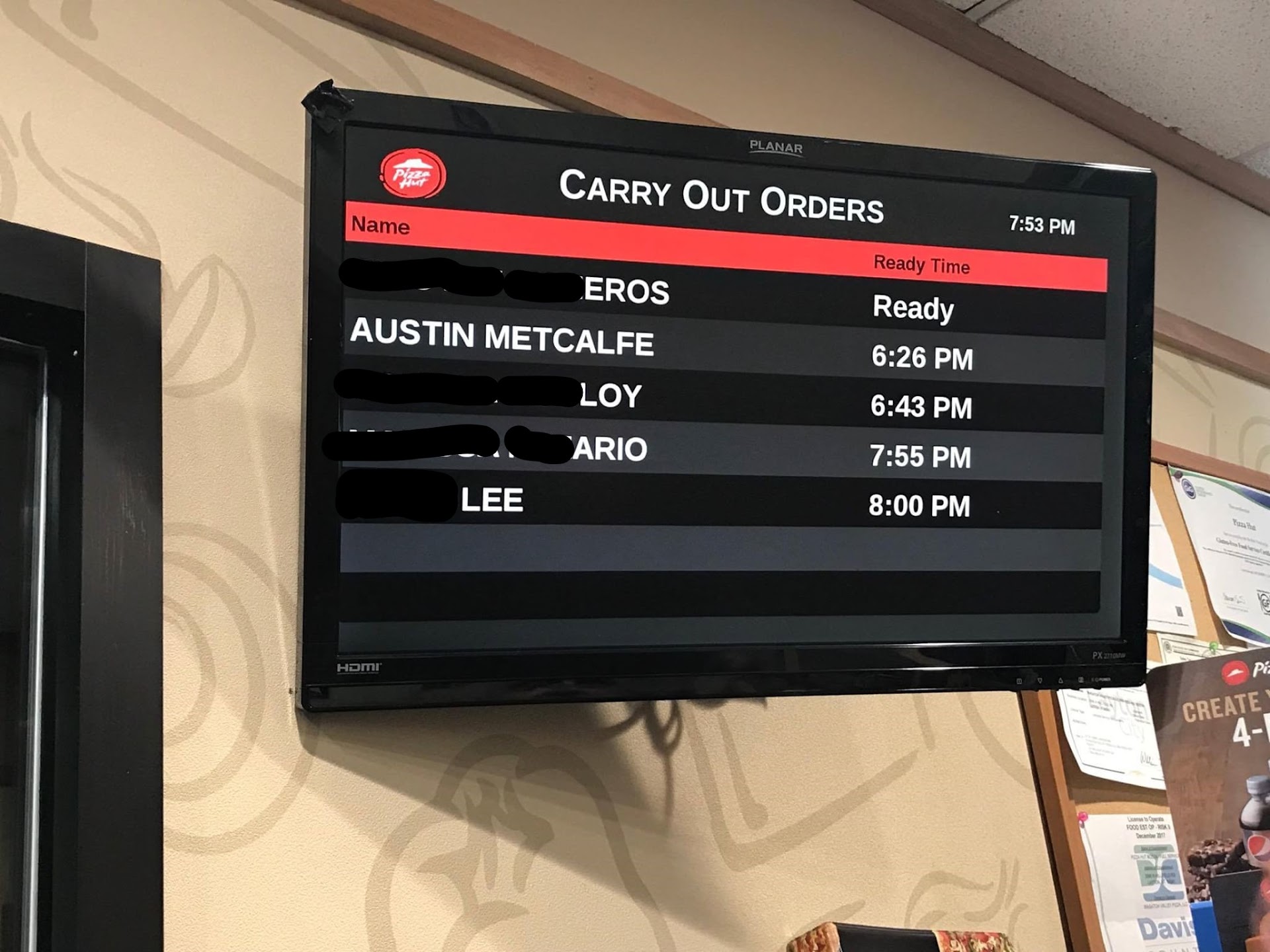 I had to settle down before I wrote this review. Two days ago, my 2-year-old and I went to the pizza hut on Hill Field Road in Layton, UT. I had ordered the online special and was surprised when my boy said he wanted pizza for dinner. When we arrived, the monitor read 6:18 pm my name was not on the board yet. It was a Saturday and the lobby along with the drive through was busy. When I got to the counter to pay the “manager” said she needed to find my order. When she did she came back and said it was going into the oven and should be about 8 to 10 minutes. We sat down and began to play, it is always nice to spend time with the boy. I looked at the monitor again and it said my pizza would be ready at 6:26 pm, seemed very reasonable. During the wait several customers had received their pizza but, others were told that their order would not be able to be made due to the store running out of pan crust dough. I watched as the manager struggled to maintain order in the kitchen, customers in the drive through, and the lobby. Many people were very upset that they were not getting what they had ordered. She was failing miserably and probably should not be in management. I felt bad for the poor lady as I’m sure it was not her fault the store had a surge of orders an hour earlier. Around 6:45 pm I went up to the counter to find out what was going on with my order and to purchase a couple of drinks. She started by saying my order was in the oven until I interrupted her and said it had been in there since 6:15. She back peddled and ran into the back to “check on the status” I watched her do a lap around the kitchen not talking to anyone about my order then come back to the front and act like I had just got there. When I said I already paid she asked for my name again and looked my order up, again. She then said that my order fell into the we are out of stock excuse and went back to talk to the other “manager” who was making pizzas. She finally came back and said I would receive 2 mediums and a large for what I had on order and it would be ready in fifteen minutes. During the fifteen minutes 2 customer came in who’s names on the monitor said their pizza was ready but when the staff went to retrieve it the pizzas had mysteriously disappeared. Both customers received a refund and credit associated with their phone number. I went back up to the counter at 7:05 pm and she went back to the oven and said they were in there and it would just be a minute. I sat back down and watched as more customers became unsatisfied with the service. It was so bad I was not able to get back up to the counter until 7:40 pm. I finally went up and said to this manager “It does not take an hour and a half to make 2 pizzas”. Maybe I am the dumba$$ that should have asked for my money back and hour ago, but instead stayed and paled with the boy while we were being told our order was in the oven. After my comment she immediately said, “I am going to have to refuse service with that attitude”. My jaw hit the floor I begged her to just get my pizza, so I could go home. She began the process of refunding my money and I lost my $h!t. and well let’s just say the whole pizza hut team was watching the counter, the manager trying to run the register was almost in tears and the other manager was trying to get me my refund as fast as she could while threatening to call the police and have me banned from the store. Not a proud moment but who the heck would keep some one waiting for an hour and a half and then when questioned about nothing really refuses service, WTH. We ended up going to Little Caesars Pizza, terrible pizza but you get what you expect. That night was the last night I will ever place a “real order” with pizza hut. Thank you for reading to the end, hope you have a better experience. The attached photo was taken right before I left the store, Thanks again Dusty for sending me this picture as my phone had died by the time we left.