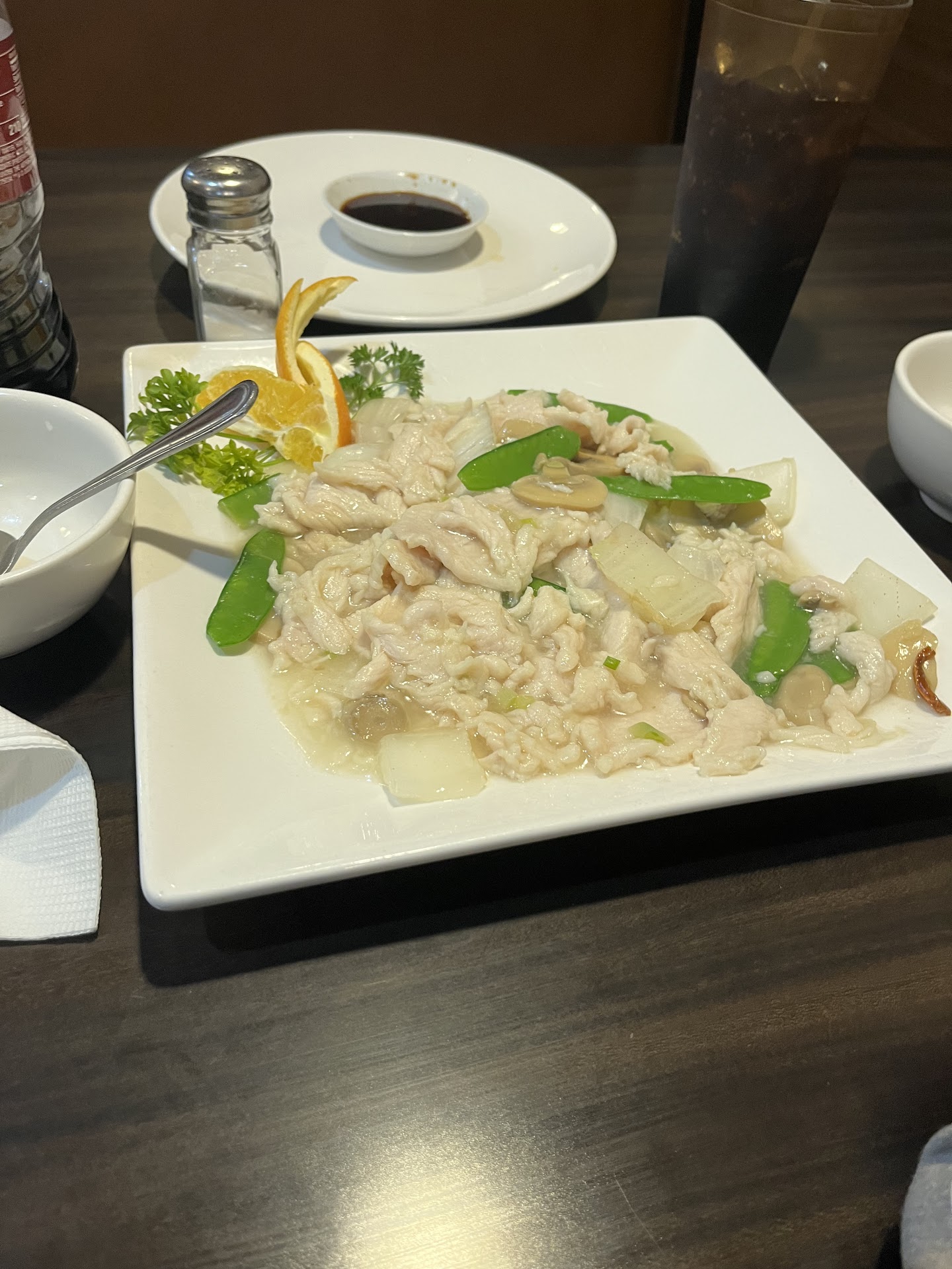 Read moreOur first sign we should’ve walked out when we sat down and they had to turn the lights on for us. Our second sign was our soda came in a bottle which is totally fine it’s the fact that our ice tasted musty was the problem. So we order some dumplings great had lots of flavor. Next ordered orange chicken a wonton soup and mushroom chicken with fried rice, the soup comes out the broth tasted okay the wonton had absolutely no flavor not a single thing it was like just a soggy ball. Next our mushroom chicken comes out when I tell you it looked slimy and grimey like it came straight out of the packaging from the grocery store we were scared. (Photo below) then comes the orange chicken it tasted old and like someone mixed oil and chilis together and said boom orange chicken. Lastly the fried rice… it was hard like it had been sitting all day and tasted like card board. If I could rate zero stars I definitely would.when the waitress came out to check on us she asked about our soup and we told her it tasted like nothing it had no flavor she goes “oh it probably was just sitting in water for too long” then goes would you like me to discount it? It was just very awkward and do not recommend to anyone we felt sick the moment we walked...
