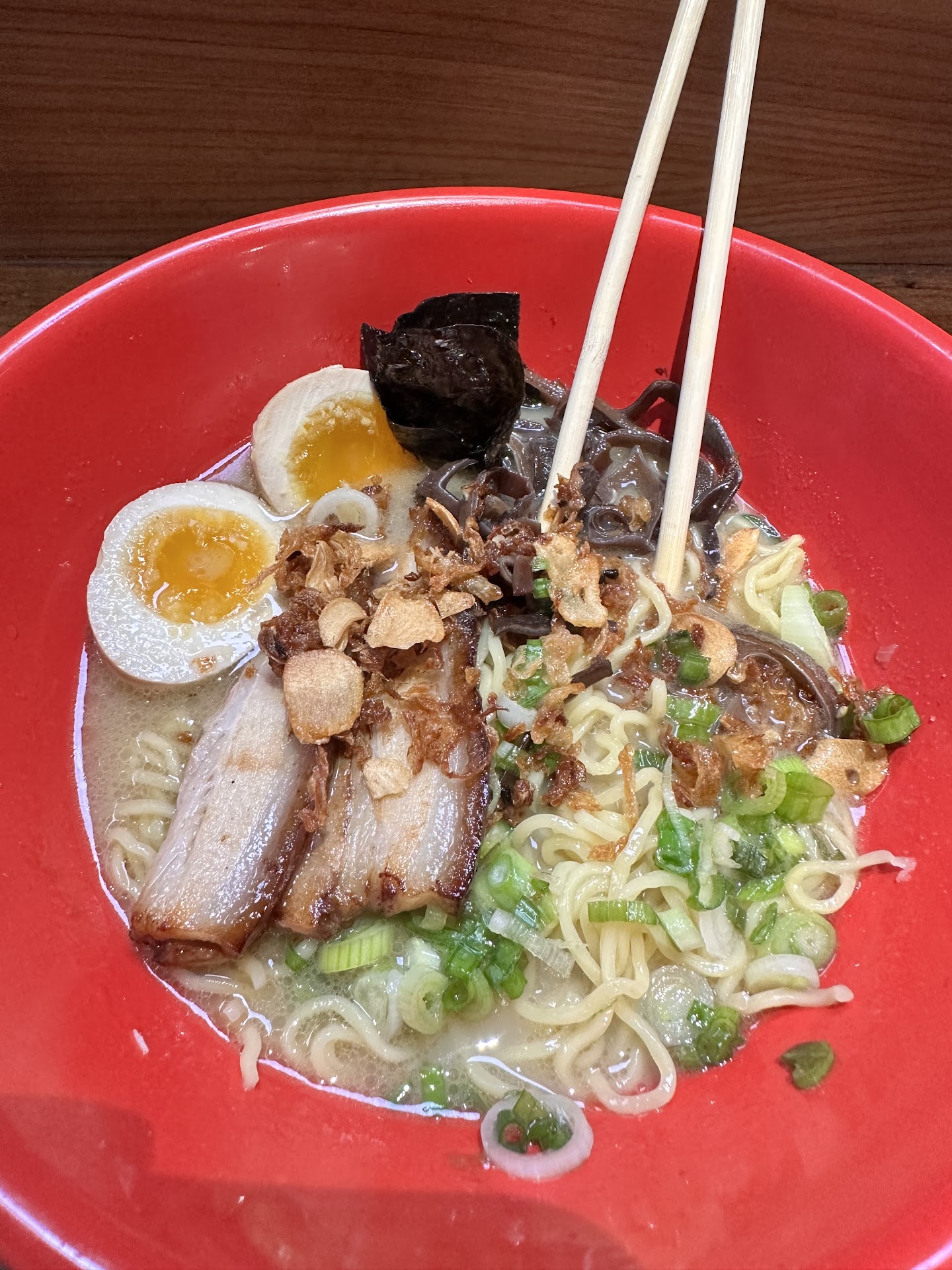 What truly elevated this dish were the carefully selected ingredients. The tender pork chashu added a melt-in-your-mouth sensation, while the woodear mushrooms provided a delightful earthy note. The marinated soft egg was a true highlight, perfectly cooked with a luscious, custard-like yolk. The garnishes of green onion, garlic chips, charred garlic oil, and fried onion added layers of texture and additional bursts of flavor.