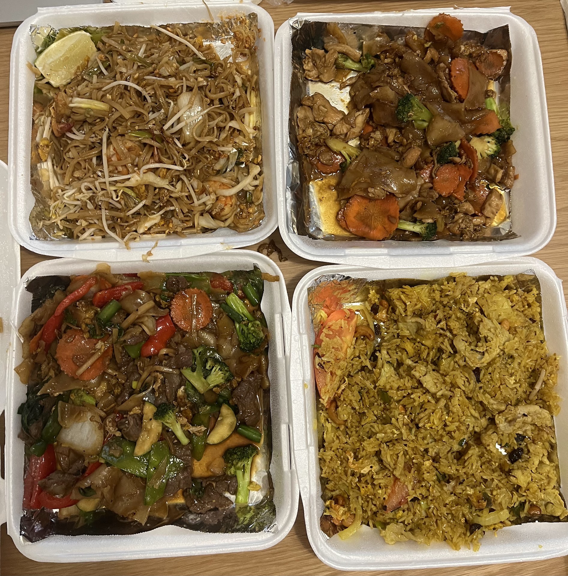 My old review- We ordered the drunken noodles with beef, pad see ew, pad thai with shrimp, and pineapple fried rice. They were all delicious- esp the noodles. We got mild spice level across the board. All of it was...