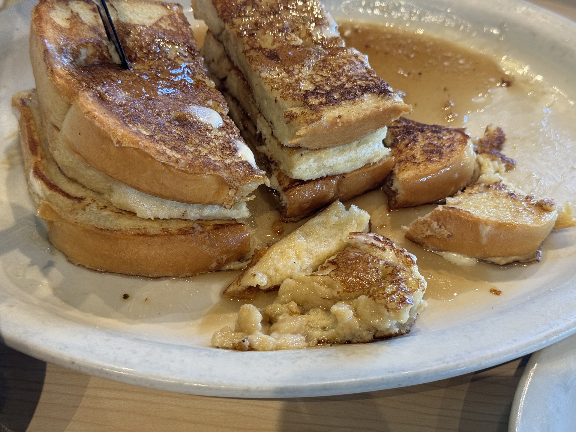 Well, we (3 people) went to try out The Toasted Yolk Cafe in League City this morning and "Ohhhh Laaawwwdddd!" 😋😋😋 I don't even know where to start, but I guess it will be by saying that our waitress was sooooo awesome, very friendly, welcoming and customer-service oriented (her name was Alyssa- 😉)! This was our first time, and I was a little apprehensive because of not being sure if we'd like it, instead of a "sure thing" go to place we are used to. I must say that this place DID NOT DISAPPOINT! 😁 We got the 2 eggs and a cake plate, the shrimp and grits plate, the Southern fried Arnold plate, the churro-style donuts, and their dark roast gourmet coffee. First off, the shrimp and grits... (visualize "biting knuckles" good 😋) were off tha hook...! 😏 -The shrimp was cooked to perfection, juicy and very savory, served atop of the grits with crispy bacon pcs. that were very flavorful as well! -The 2 egg plate had scrambled eggs, 3 pcs. of bacon, hashbrown cassarole, and a pancake that was very fluffy and the size of frisbee! 👀 -The Southern fried Arnold plate had 2 biscuit halves that were topped with 2 very nice-sized, crispy and tasty fried chicken strips, topped with poached eggs and sausage gravy! The eggs were cooked perfect with plenty of runny yolk to cover each little tower. It also came with a side (we chose the hashbrown casserole, since we had grits with the shrimp). -Like churros? Well, you'll love the churro-style donuts (4 pcs.) served with caramel sauce... we got them first and enjoyed them very much. The donuts were doughy and crunchy, fried perfectly... sooo good! The coffee was strong and enjoyable, especially with the donuts...! All in all, for the price (pic of tab included for reference) and portion sizes, THIS PLACE IS A MUST!, and you can bet we'll be back...