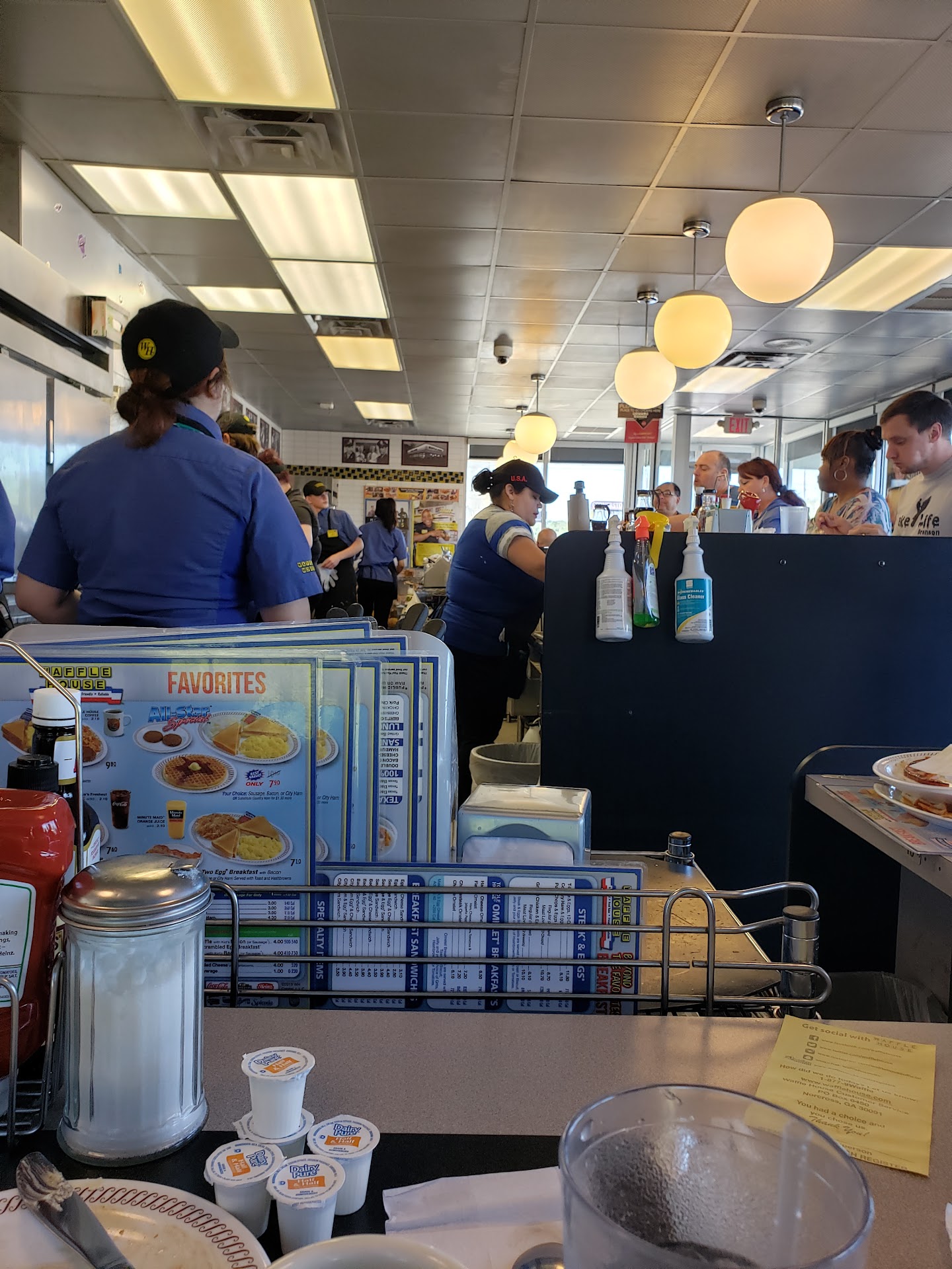 Walked in, bar full of dishes, 2 tables full of dishes. Manager finishes cooking the food and walks to the back. Staff just standing around. No one pre bussing at all. I started cleaning one table and my mom started cleaning the other. One person walked in and a staff member just ignored the person when he is trying to order as they did us and the grandmother and grandson who came in at the same time we did. The excuse was we are shortstaffed. As a former employee of Waffle House over 20 years ago, if we did not prebus or say Welcome to Waffle House, we would be sent home. If we talked to our customers the way that they did, we would have been fired. When you see the server just pick up the tip and not clean the table, then you know they do not want you there and are just waiting for you to leave. Her comment was, I guess I am not leaving early. They had 5 servers, 2 cooks and a manager and none of them can take care or help if they were "so busy". No teamwork, nasty attitudes. When the comment was said that we were previous employees/managers of there, the waitress said then get a uniform on to help. When we pretty much did by bussing the tables for them. What happened to the customer is always right? This is NOT the Waffle House Way. The entire shift, if not the entire staff at the store, needs to be retrained the Waffle House Way from management to server or SHUT IT DOWN!! That is ok. Cracker Barrel got our money since they did...