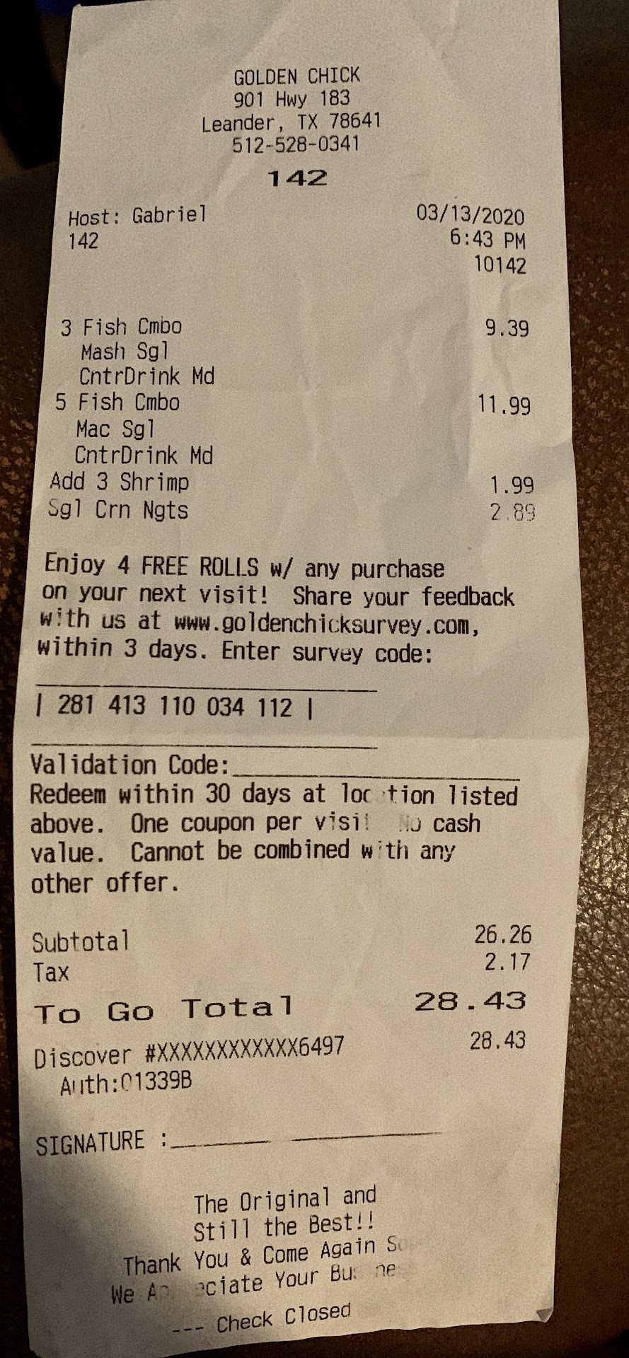 Catching up on my reviews. (I take notes and keep receipts to ensure Iâm on point when I enter it!) We visited this Golden Chick March 13, 2020 during lent. We enjoy Golden Chick for Chicken but we really like the way they cook their catfish. They are very flexible with their menu. They have many âcomboâ choices in roast chicken, fried chicken and southern fried catfish. Something that I had not seen on previous visits was fried shrimp. On this visit (take out as the news from all over the đ world was Covid 19 although we werenât under any orders yet) Friday the 13th it was lent and so we both opted for the Southern Fried Catfish Medium Combo. I ordered the 3 piece and hubby the 5 piece meal. This particular combo came with One Side and a Medium Drink. There was also a special where you could add three shrimp for $1.99 extra so we opted for one of those so that we could try the shrimp. Hubby got the macaroni and cheese for his side and I got the mashed potatoes and we also ordered an additional single side of their famous corn nuggets. Everything was hot and delicious and stay that way until I arrived home. I want to go back to the options to let you know they have a huge variety of sides -at least 9 options s you can get them in a single serving or a larger family style serving. We each tried a piece of the fried shrimp and it was good, however it is not something we would order again because we prefer the other main dish options over the shrimp. They also offer chicken and fish sandwiches, and several main dish salads along with a side salad. Their yeast rolls are light and fluffy and so tasty. They have several fountain beverage choices along with sweet and unsweet tea and pink lemonade. I have never had a bad experience at this location in Leander. I have use their drive-through, pick up, and dined in. The property is clean. Their associates are very friendly and very helpful! We wouldnât hesitate to recommend it and should you decide to go give some thought to trying the fish! Itâs so good even when...