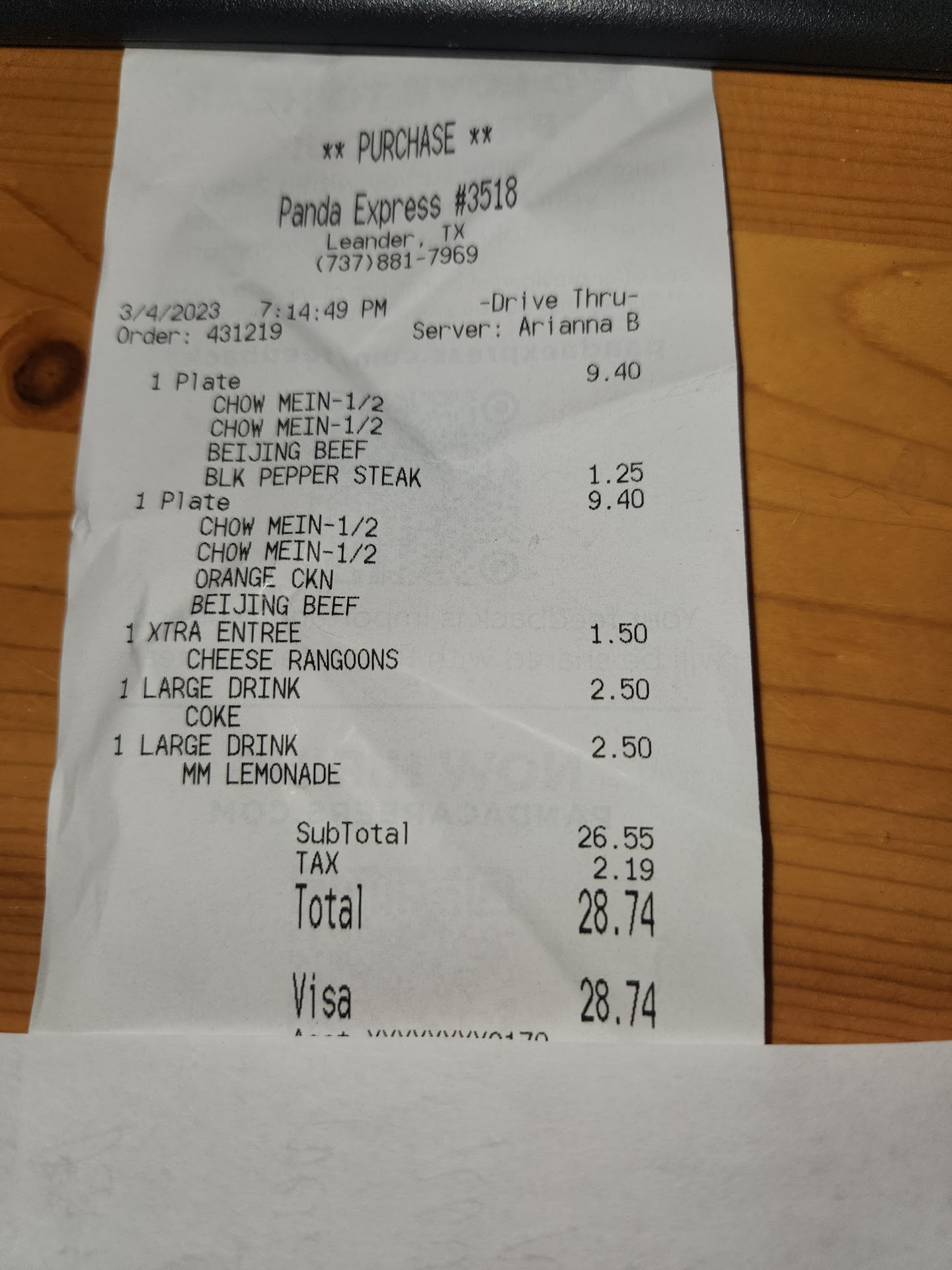 This was our second order. First was p/u and tonight-delivery. For the holidays they are offering free delivery with a $10 order. We don’t usually do delivery, but it was really appreciated today. I ordered Orange Chicken with Chow Mein for hubby and Kung Pao Chicken with Greens for myself. This did not go smoothly at all. About 20@ into the order I received a call from Gary with Doordash. Evidently panda is using DoorDash for their free deliveries, so I assume that means they are compensating them. Gary advised that my order was not there . I pulled it up again on the Panda Express app. I also pulled up the email, confirming the order and offered to give him an order number after a few minutes of him talking with the panda express people he advised they could not find my order, I offered to give them the order number but at that point all of a sudden they located it. He said since he was on his way home, and I lived in between the restaurant and his home he would go forward with the delivery. Otherwise Doordash would probably assign someone else. I was fine with that, but I did let him know that if it got to be too long just to let me know and I will cancel my express that I was I expressed that I wasn’t very happy with the fact that they said they didn’t have my order. Sometimes I don’t know whether to love or hate electronics because I’m not sure at this point we could live without them, but they sure can mess things up. Anyway, Gary ended up arriving about 40 minutes after the order with our order in tow. They had also given him a large drink, which I offered to him since I did not order it I gave him a bit of a additional tip for his trouble when we opened our order, I found that they had added , as a courtesy, I guess due to the mixup …a dozen eggrolls. Holy smokes! it was very nice of them to do that . I ended up freezing them since I am avoiding carbs and the hubby doesn’t care for them. As far as flavor the orange chicken has become too spicy for the hubby so he will have to find something different next time. I barely got through my Kung pow chicken as with all the peppers that were in it I thought I was going to implode. So it’s not a poor review, but it’s not a great one either. I did appreciate Gary with Doordash hanging around for quite a while so that we would...