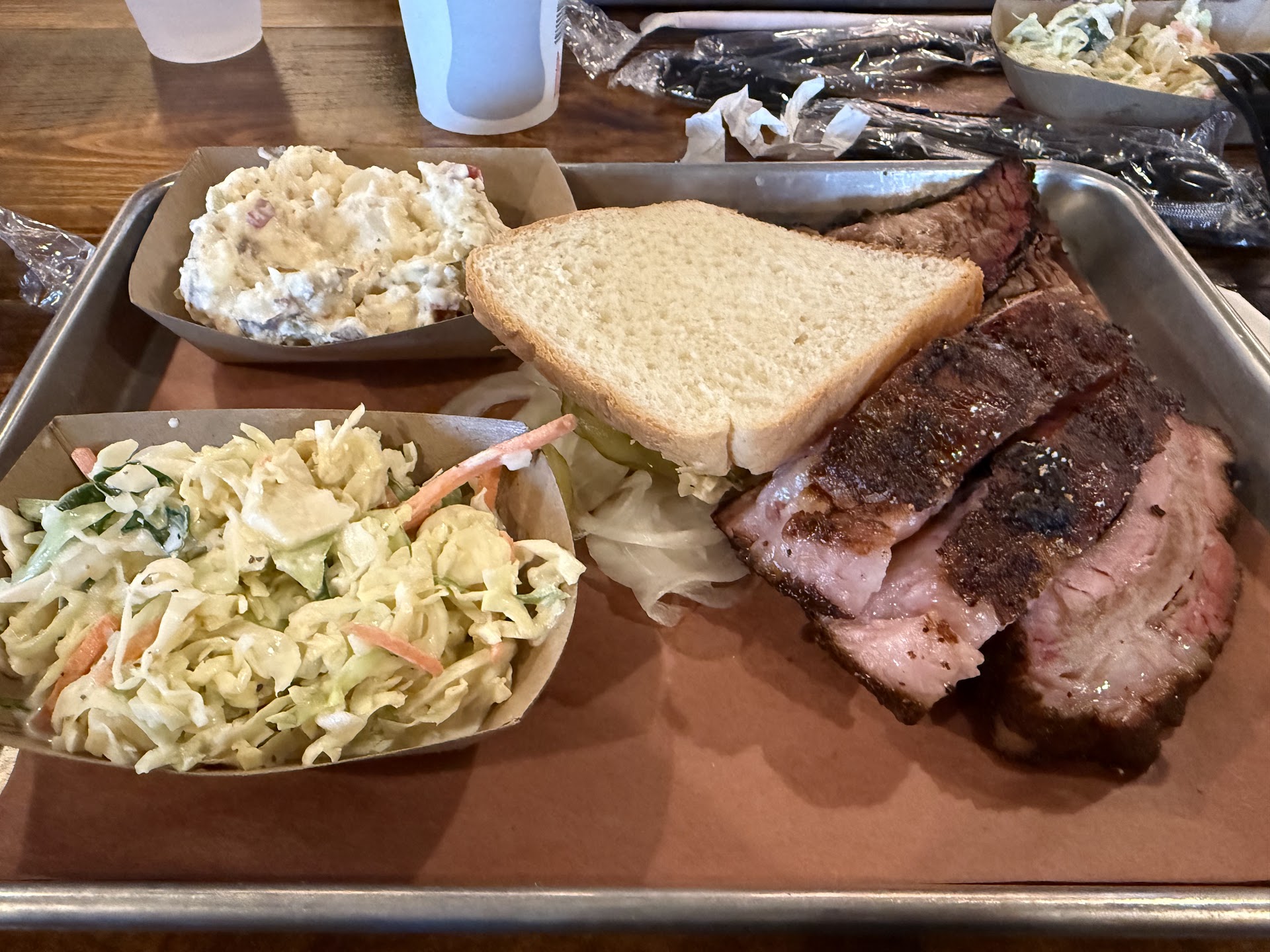 Disappointing and so sad. Wife and I went to the Leander location on Father's Day (June 15, 2025) around 3:00 PM. It was crowded. People in line. The wife ordered a 2-meat plate (sausage and brisket) with potato salad and mac & cheese. I ordered a 1-meat plate (ribs) with beans and potato salad. When I paid, the cashier offered bread and I received two pieces of white bread that were drying on the outside, as if the bread was sitting out somewhere to dry out. We got our food and drinks. I loved the beans and potato salad. The unsweetened tea with Sweet & Low was good. And the ribs seemed big so I tried to take a bite. Nope! The top was rock hard. I peeled it off to find the whole thing was mostly fat. Both ribs were like that. I could see some small pieces of meat which I had to search for in the fat. The meat tasted funny. The ribs did seem big for pork ribs. Normally, I would have taken it back and said, "Uh, NO!" But we were trying to make a timed event so I let it go. My wife ate only a little leaving most on her plate and only taking about a bite of the side dishes. She said she was done. She did not look pleased. I took a bite of sausage and it wasn't bad. I picked up a piece of brisket and it was so dry the piece stood up straight. I dipped it in their BBQ sauce, which was not spicy. I liked the sauce. I went to get the banana pudding I had ordered. The lady behind the counter looked around, said they were out of the pudding in bowls, and retrieved a small styrofoam container from a refrigerator and gave it to me. She said it was the same thing. I thought, "You mean I paid that much for something so little? Wow! More expensive than a rib-eye." It tasted good, the few little bites anyway. Often, I will take meat left over from a meal for our dogs. I looked the "ribs" as I wouldn't feed it to a dog. We exited the building and my wife said, "Please, never take me to eat here again." I told her not to worry we were never going back. I have eaten at a number of BBQ places. Never have I received such poor "ribs" or dried out brisket. I thought of going back to speak to a manager. Know what's crazy? That night I had a nightmare where I was there trying to speak to a manager and kept getting sent to the wrong person. The next day I felt ill to my stomach but it couldn't have been the ribs, could it? There wasn't even a full bite of meat between the two. And I had been so excited to go there for...