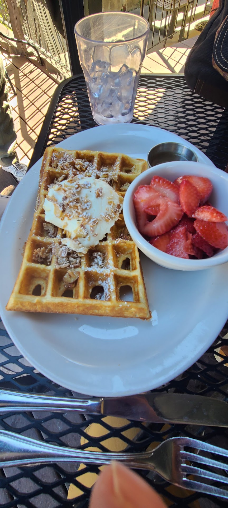 It's a charming little restaurant that offers both indoor and outdoor seating. We opted for the front patio, where we savored the delightful combination of waffles and chicken. The chicken was cooked to perfection, and we couldn't get enough of it. We also tried the 5-spiced salmon latkes, which were a unique and flavorful choice. Not spicy at all!