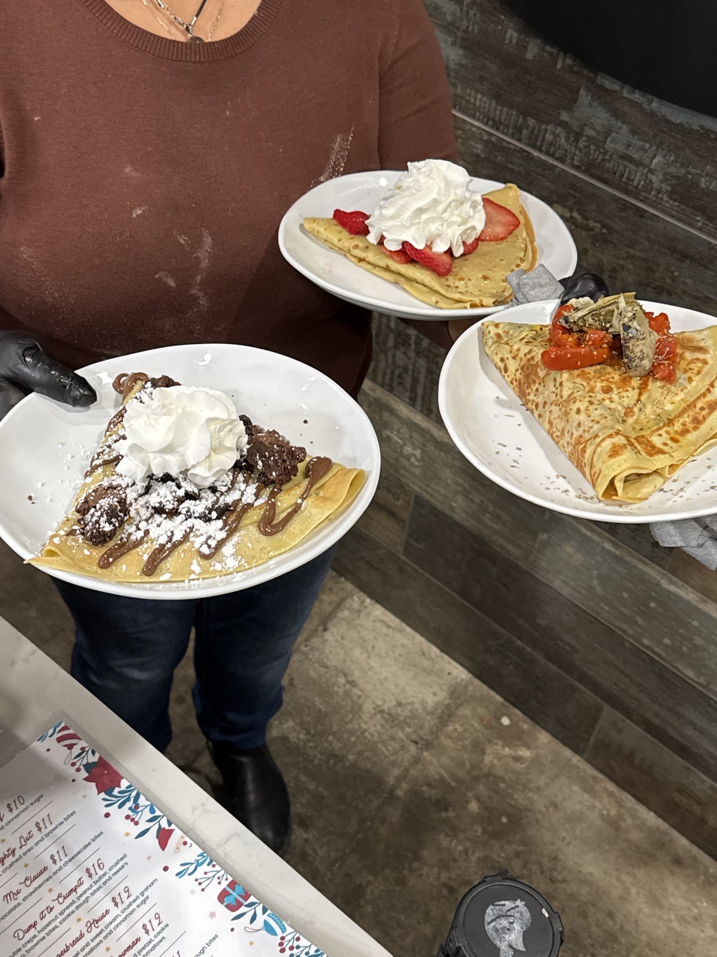 Read moreThe menu has a good mixture of sweet and savory crepes. Since we got our food to go, we stood at the front counter and watched them make all the orders (5). While the two workers were nice, they seemed disorganized. While they used different scoops to put the filling on the crepe, they used their gloved hands to disperse the it on the crepe. The problem with that was that they didn't change out their gloves during most crepe orders. Anyone who has an allergy to one of those toppings could still potentially get it in their crepe and cause a reaction. They had 6 crepe makers and used all 6 at one time. I ordered a stacked crepe (2 crepes) and instead of making both of my crepes at the same time, they made one after another which I found odd since 4 other machines were open.