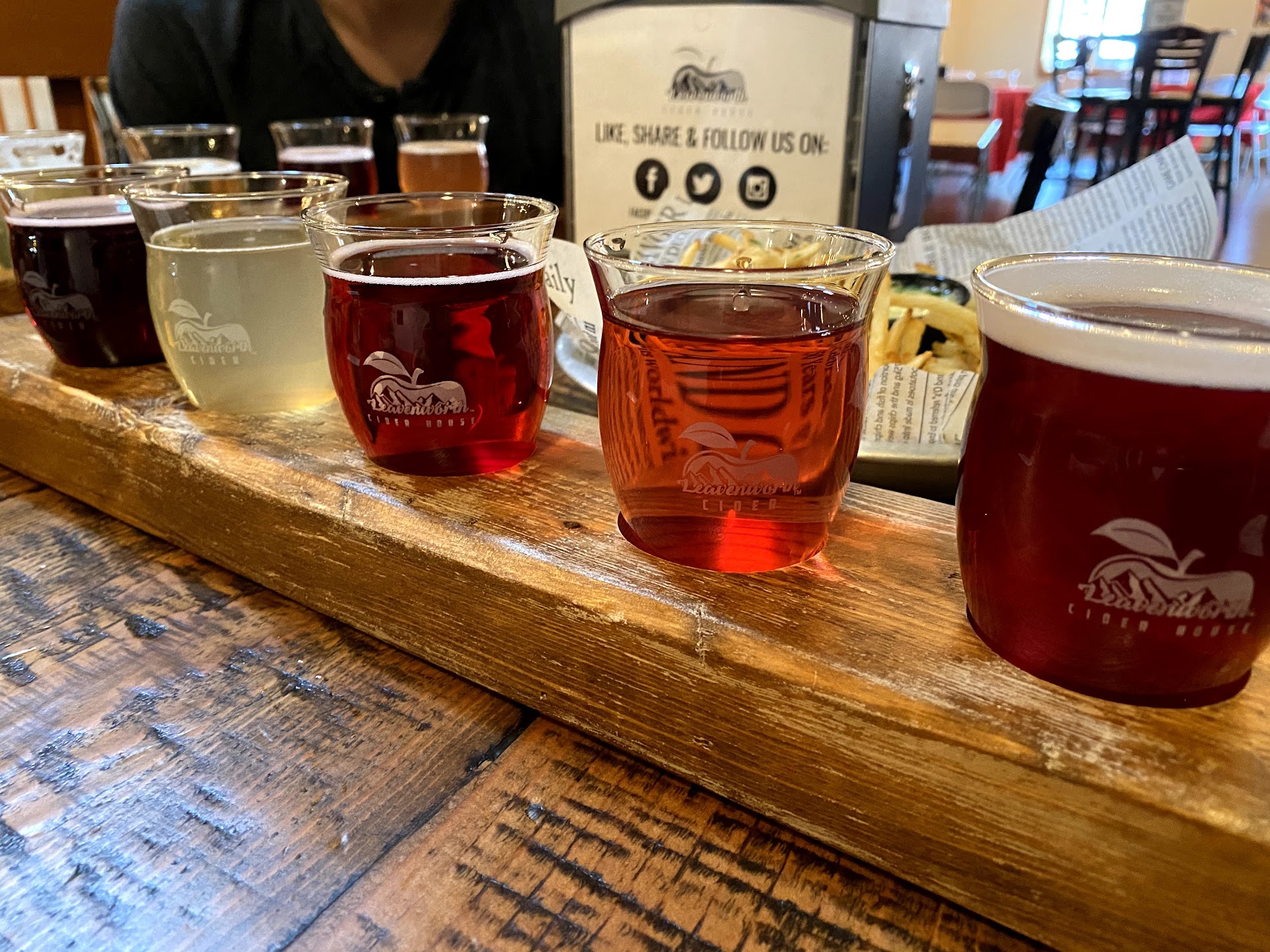 One couple came in and she asked about hot apple cider (not super common but very good and can be found at at several of the other local cider places). The bartender had the brains to suggest they try Starbucks but did not suggest any of the other local cidery locations, assumedly because she either didn't know or didn't want to advertise for a competitor. Next best was inaccurately claiming to have the most cider taps in Washington. (Shilling has 30ish taps). She lacked knowledge about the product, and I would assume was fed lies so as to make the Levenworth Cider House sound better. She had nothing positive to say about any of the other local cider companies. As soon as we ordered, we were of no interest to her and she went back to flirting with her boyfriend(?). So costumer service was lack luster, and she had to continually be called back when anyone had any questions.