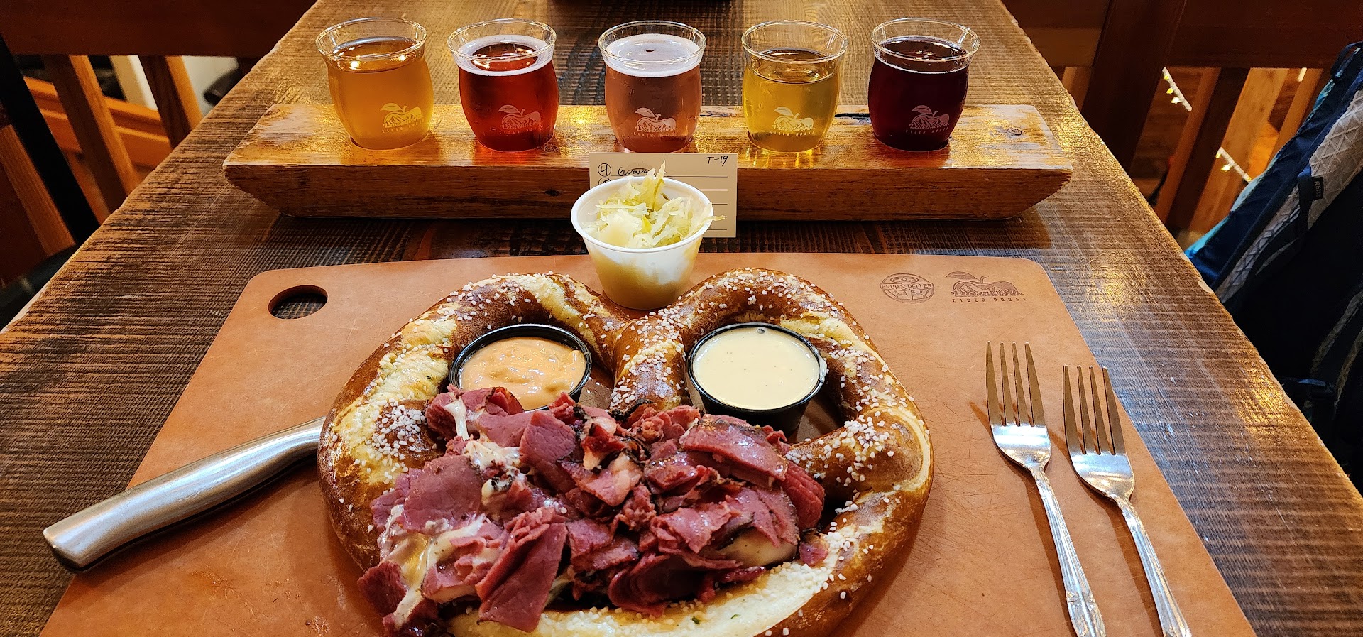 Read more@YourCiderHouse is a fun place with a ton of ciders, some great beers, and tasting flights too. They offer some brewery type foods that include a couple of brats, pulled pork sandwiches, some flat breads, a giant pretzel and truffle fries and a kids menu. Upstairs where most of the seating is located, they have some games such as big Jenga, cornhole, large connect four, etc. One thing my mother-in-law thought it was great is that they also have an elevator, because she had a hard time with stairs. This is also very helpful to families with little kids and strollers. I ordered the Hop-infused cider and it was very tasty. It had a classic dry apple fresh taste with the aroma and taste of citrus hops (7.4% ABV, n/a IBU). My husband had the High Camp Winter IPA which was very smooth and tasty, a perfect choice for someone who wants a refreshing and mild IPA (7.3% ABV, 84 IBU). We also had the house brat, a very nice brat topped with a cider-infused cheese sauce and topped with chunks of beef brisket. My mother-in-law had the pulled pork sandwich with the house coleslaw. It was delicious too. The customer service was amazing, they were very knowledgeable and accommodating. The setup of this locale is such that the order counter is close to the entrance. There you place your food order (as well as ask to taste any of the beers or ciders), pay, and take your drinks. Once the food is ready, they send you a text message and you pick up your food at the kitchen pick up window, located at the rear of the...