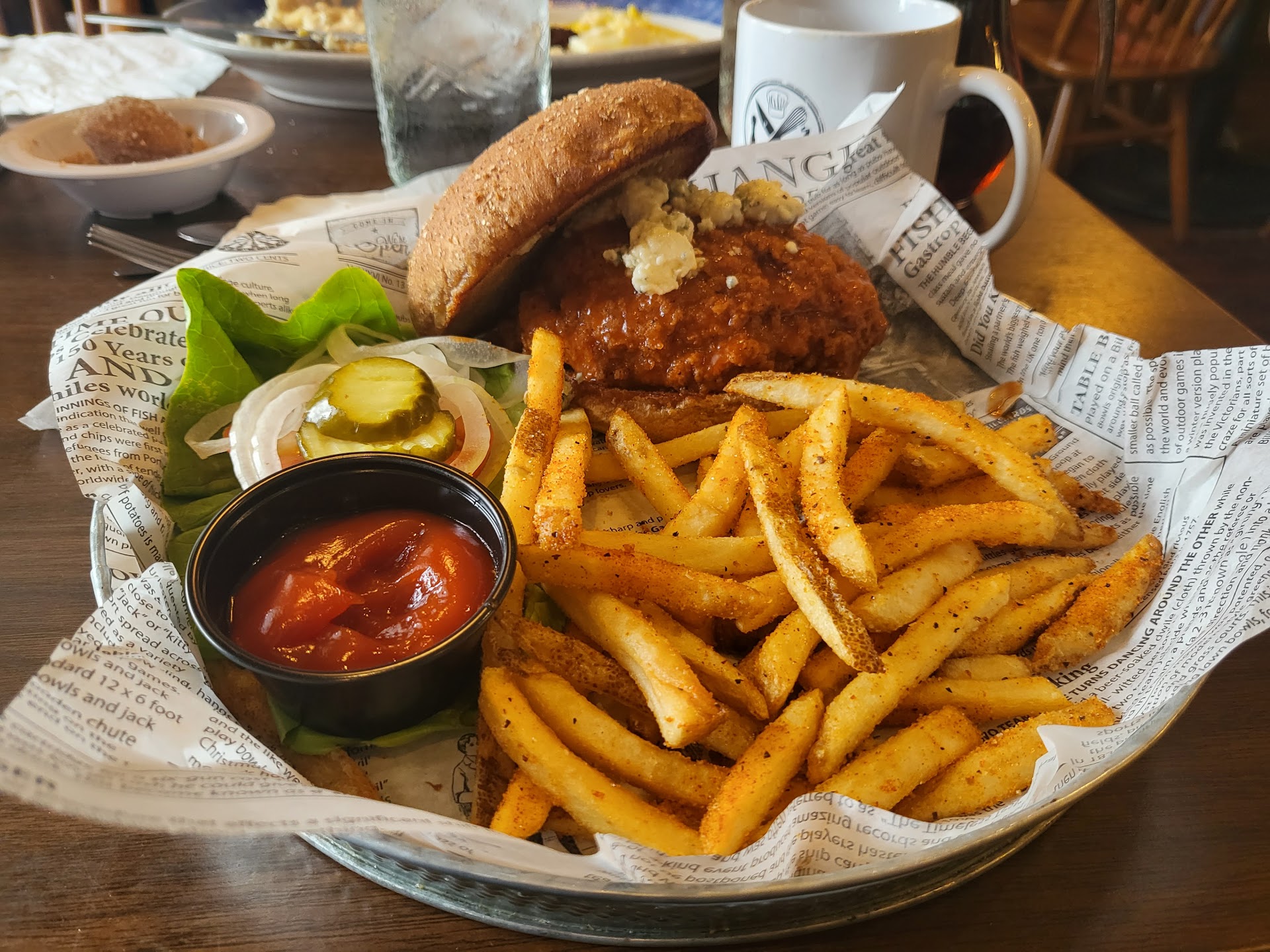 The food was excellent. I had the spicy chicken sandwich and fries. Make sure you get the optional seasoning on the fries -YUM! The chicken was perfectly fried -juicy, and not too crispy on the outside. The complimentary topping some people normally toss aside we're also fresh and presented well.