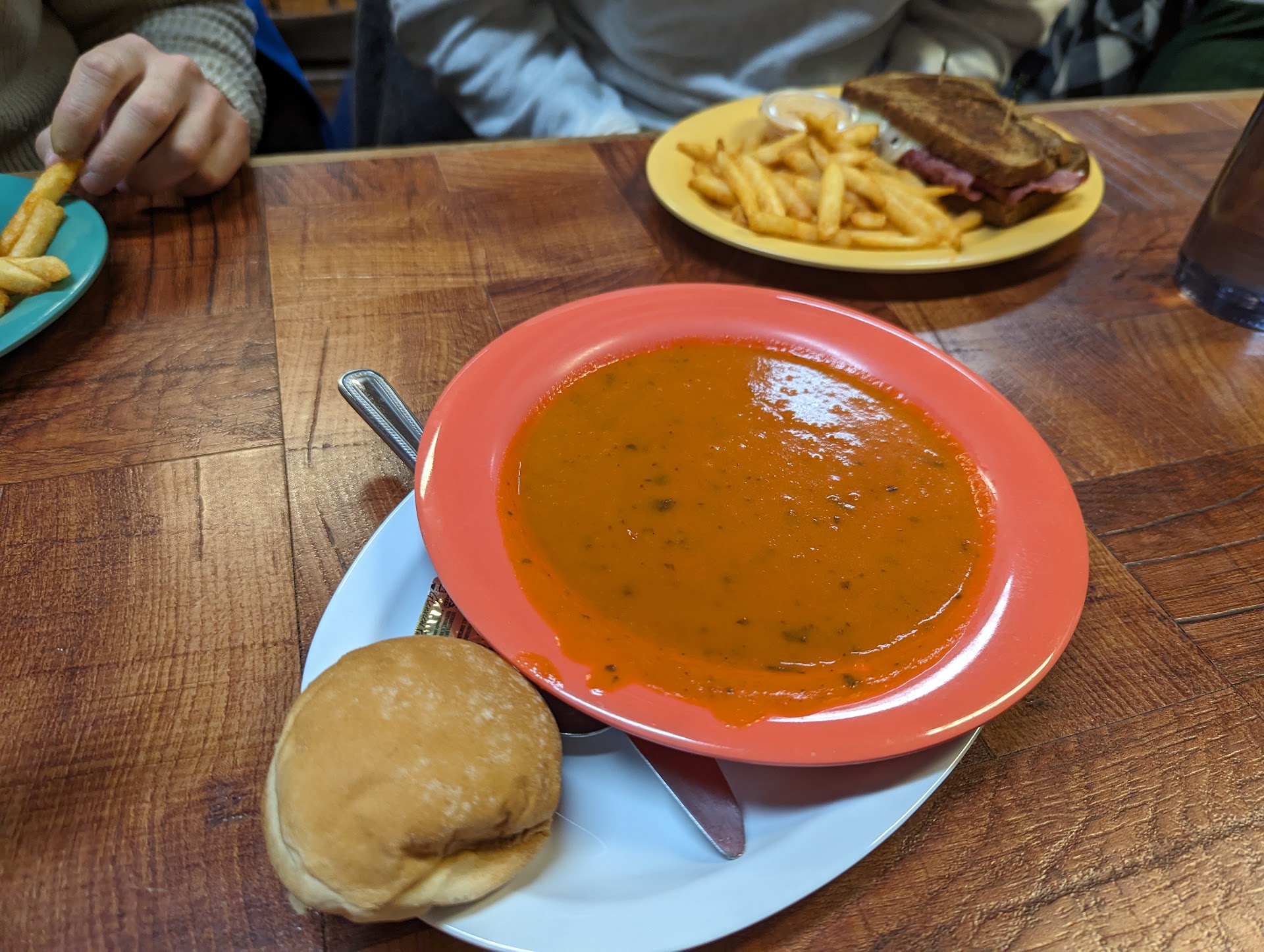 Read moreThe food looks sad and tastes so so. My vegetarian burger is dry. Everyone else's food looks underwhelming. The tomato basil soup is good. The wait isn't 5 hours like at other restaurants on a super busy day in Leavenworth but that's probably because it tastes so bad compared so most people don't come here. One white waitress was very rude and discriminatory. 5 of us got to the front, one person was about to place an order for everyone, I went ahead and found ourselves a table and sat down. Immediately, she came and asked if my dog was a service dog and said that I couldn't sit down before paying, and she also needed to sit other people first before I could be seated WHEN THERE'S ANOTHER AVAILABLE TABLE near the back wall. Not sure if she targeted me because I'm Asian or disabled but that's so rude. The other 4 people were literally in line, about to pay. I didn't want to deal with an inconsiderate person so I stood up and walked away from that table. When we eventually sat down, a different waitress serving the table next to ours is nice and warm to those customers, I felt unlucky. When I went to use the bathroom before we left, there was a line and barely any space so I held my dog in my arms, and received a nasty look from another customer standing next to me. That same rude waitress happened to be right there as well and they exchanged an unpleasant conversation. I left the place right away instead of...