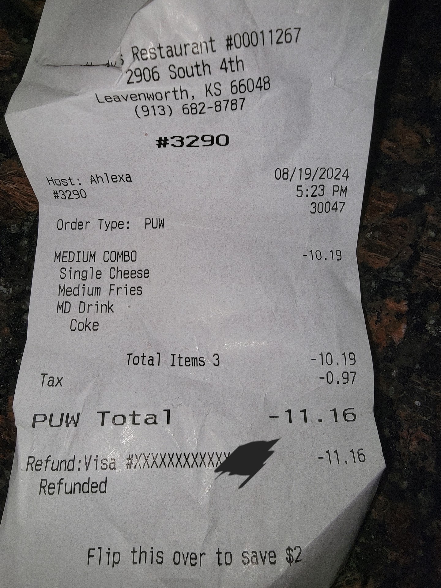 This time, we ordered the Dave burger (with 3 patties), and i had ordered the Southwestern Avacodo Homestyle burger. They gave us: 3 cheese burger, and a waaaay overcooked chicken burger with no avacodos... They gave us a potato...? But i don't know why... it didn't have cheese, bacon, etc. Just cut down the middle in a quick sloppy way. Did they give us someone else's food that they forgot?? Or was it a lame "apology potato"... a potato, really??