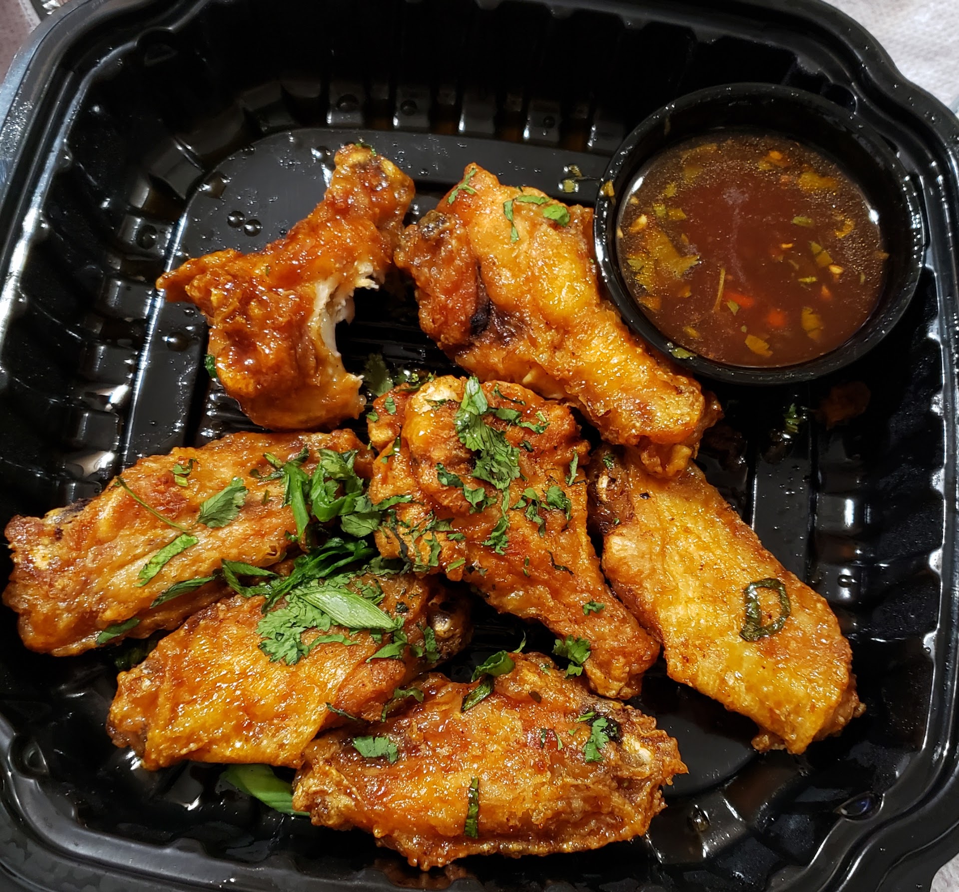 My exact order was Sedona Shrimp Pasta add chicken, Thai Wings (all flats) fried crispy with extra sauce (all sauce on the side), House salad with white cheese and blue cheese crumbles as well as ranch and blue cheese dressings.