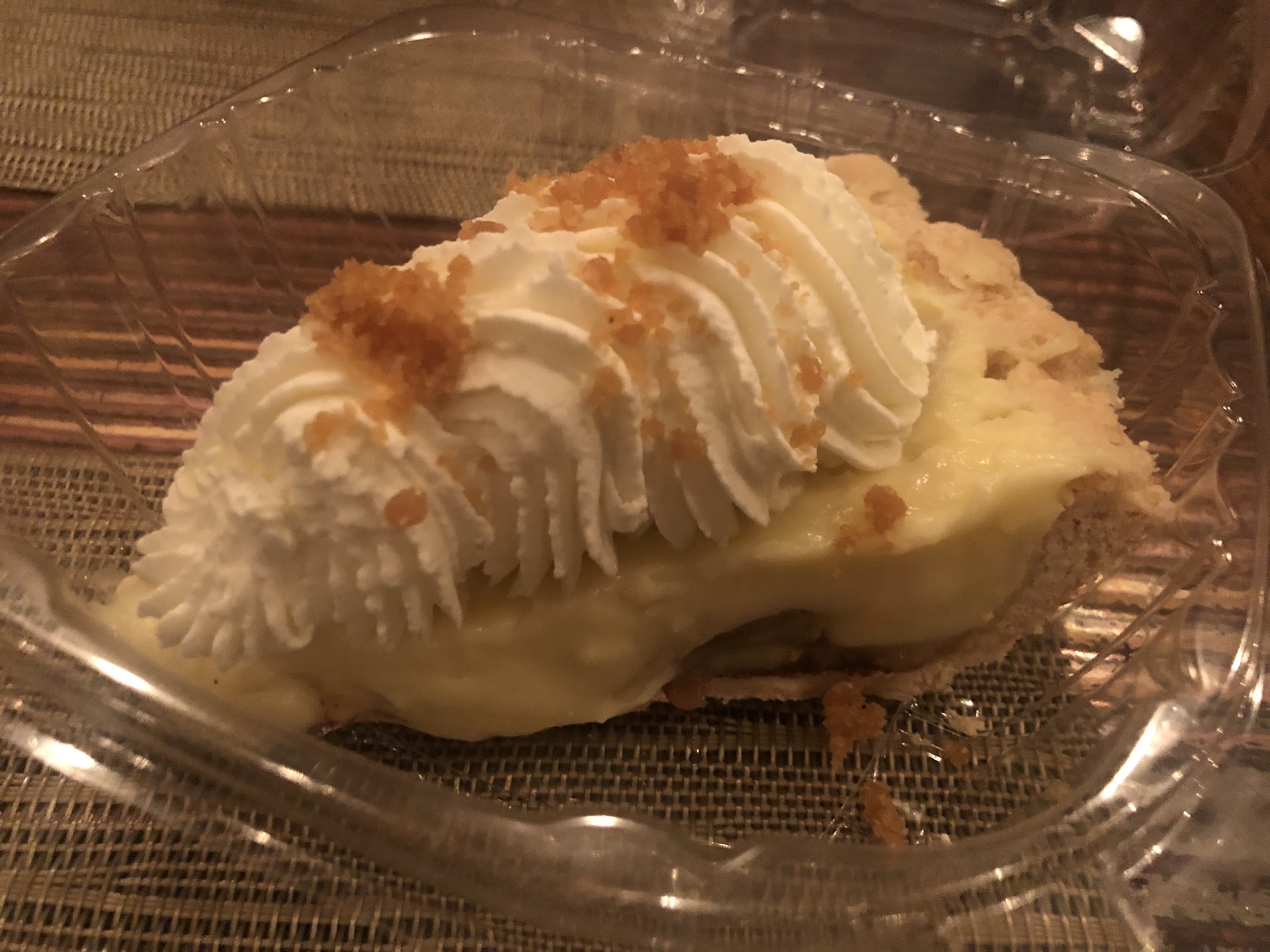 The service was pretty bad. We are not from the area, which is affluent, so we might have been underdressed, but it really shouldn’t have made a difference. We were dressed casually. The drinks took way too long to arrive, and after making the order, we didn’t see our waitress at our table but three more times. The first time, when we asked for more water, which never arrived. The second time she appeared, apparently with check in hand, to ask if we needed anything boxed up instead of asking if we wanted to order dessert or coffee (missed opportunity). Regardless, we asked for the banana cream pie (pictured), which was worthy of a college cafeteria at best. And finally, the waitress arrived when it was time to pay. As soon as I laid down my card though, it was snapped up. That was an indication to us that she wasn’t too busy, but that perhaps we weren’t worth her time. The icing on the cake was that it took far too long to get my card back. People have bad days, so who knows what was going on, but there was never an apology for the wait, nor even an acknowledgement for it.