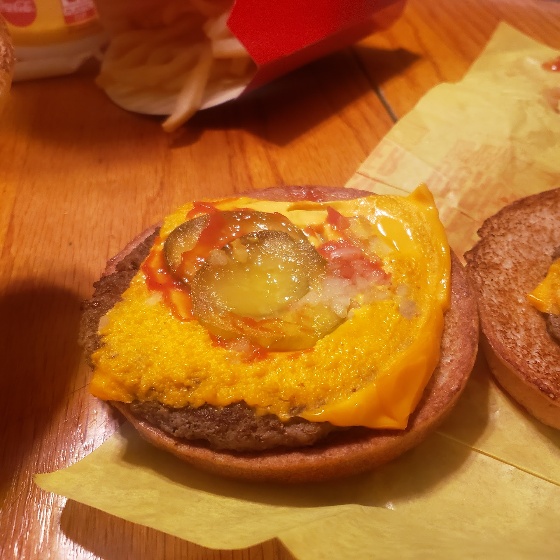 Read moreOrdered double burger with no pickles. We get our order, sit down, and before we can even go thru our food, employee comes over and is digging through our bag at our table without even saying anything. Finally after staring at her, she says "sorry I think they gave you the wrong sandwhich" and then says "no it looks like they're right." And walked away. Decided to eat in the truck after that. Open up the sandwhiches and she was in fact right, there was pickle. Whole situation was bizarre. Pickles are easy enough to pick off. Just weird that someone would invite themselves to a customers table and start rummaging thru their food. Glad we didn't order fries, I would not be eating them when a cashier just dug through all of it with bare hands...