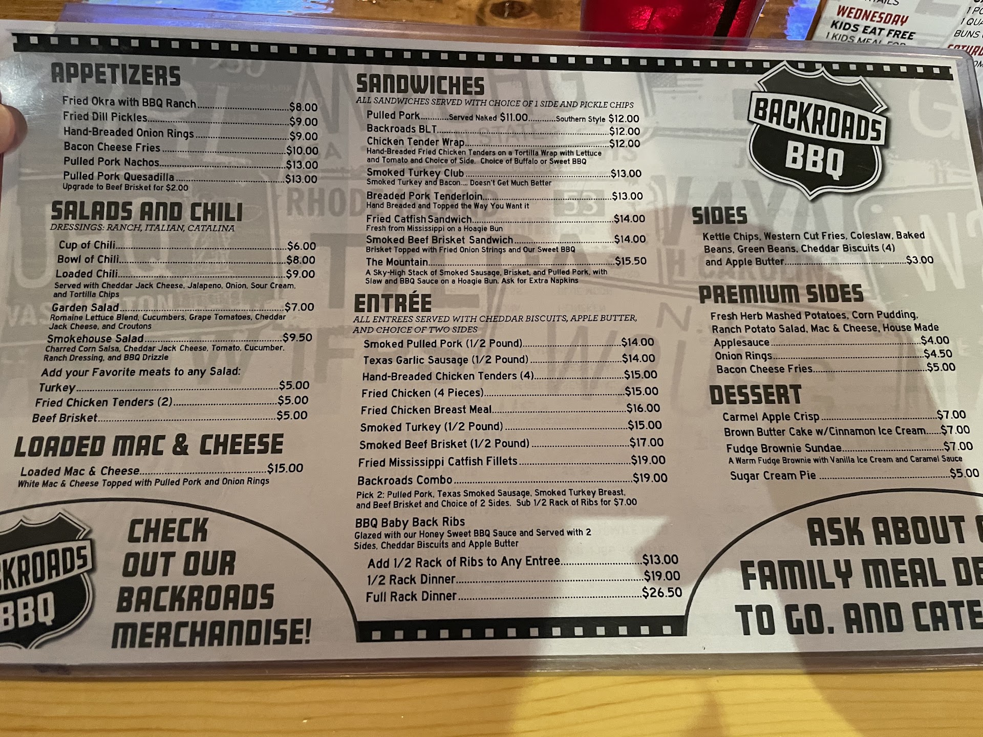 Read moreFood-we came with plans of ordering the cheddar biscuits with apple butter and to my amazement they came with glasses of water, and with a table of 4, they didn't last but the server had another basket on deck. I'm not sure if the extra basket came with an extra charge, I never looked because we came to eat and review. I said bring um, they brought um. Delicious! way to start. We missed the starters after devouring the biscuits and went str8 to ordering our mains. Daughter got the classic Backroads Burger with Baked Beans. my son got the 1/2 lb Brisket with Cajun fries. My wife ordered the classic Mississippi Catfish sandwich with corn pudding and pasta salad. I wanted the 1/2 rack of baby back ribs with cole slaw. only complaint was from me, and that was about the abundance of vinegar I could still taste. assuming it's all vinegar based, which many items are, vinegar stands out for it is very potent so knowing customers are ordering multiple items containing vinegar, as you would with salt, a smaller moderation of vinegar should be used on the menu or a separation of vinegar by having it on the table but thats just a suggestion. Service-highly friendly as we had a young 18 yr old so when it came to our specialty drinks, she wasn't age appropriate for taking the order though she did which wasn't at fault to her but possible management delegations that should shift to 21 yr old and older servers since an age appropriate server had to deliver them for her it just feels like as a facility they should avoid the possibility of influencing the youth by allowing them partake in the ordering of such. my suggestion her is to install table communication software that scans the ID and leaves the ordering at the table and verification upon delivery. But all the food arrived in a splendid timely manner and the server checked up on us routinely. Atmosphere-knowing it was going to rain between 4 and 5pm, we decided to arrive 6pm. We didnt want the place to be empty but we hoped it wasn't full either, makes it easier to judge moods of the staff and timeliness. As we arrived we came in thru the back parking lot meaning they have both front and back entrances and exits. Not seeing many cars we figured they belonged to staff and maybe we woukd have the place to ourself anyways. There was a customer at the abr area and a couple near the area we were sat, but all in all it was peaceful. The wall decor could use a mix but 'Backraods' being the brand I understand the abundance of license plates and streetsigns, but doesn't Backroads have a deeper meaning that could be metaphorically explained with signage? Which brings us to the next question-Will I be returning? absolutely because there are another round of items I'd like to try and add to this...