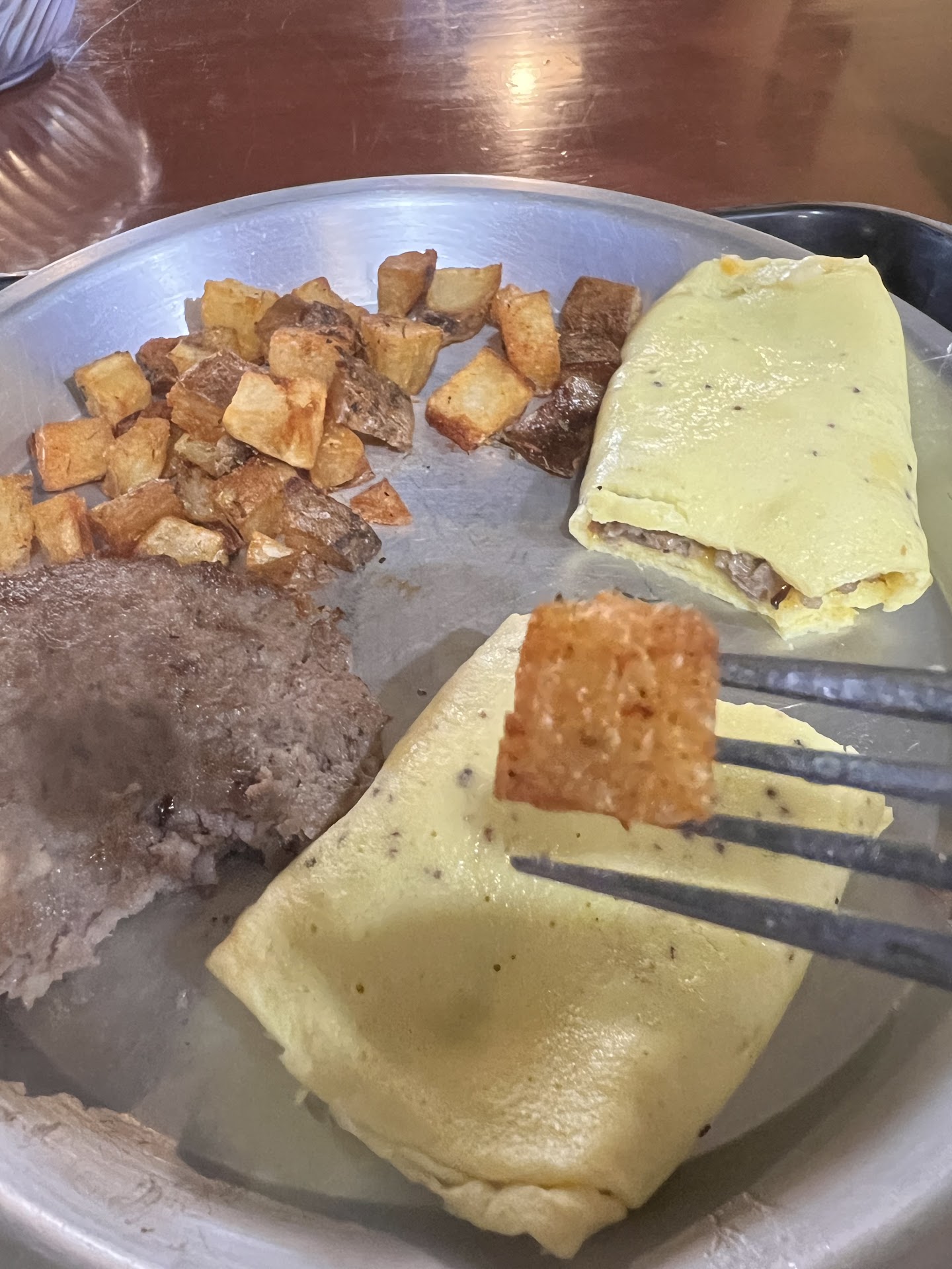 Read moreImagine going to a friend's house for a casual brunch party. No pre made food, they ask what you want from a list of options. They then proceed to make each meal for their guest individually. To perfection. That is this place. Small, put in your order and grab a seat. Chat with your companion(s) play on your phone- occupy some time while your meal is prepared (in the order it was received). The food comes out on a tray in pie tin. I dont care for "home fries" and was disappointed so see that was the option. O. M. G!! They are seasoned and crispy on the outside. I am embarrassed we asked for ketchup. DONT ASK FOR KETCHUP. YOU DO NOT NEED IT! I cleared my plate down to the crumbs. I had the meat omelette. Oh yah, the side sausge patty was not a store bought little circle. This appeared to be hand pressed. Very tasty. My boyfriend had the cinnamon sugar pancakes. I had a small bite that just burst with flavor. Is it fancy? No. Do you have to work a bit... I mean, you put your order in, but they bring it to you and come around. If you need a refill you can wait or get up off your entitled butt and go ask for one. Why you ask? Because you are at your friend's house and they just did all the cooking and cleaning. To all the negative reviewers- dont go to a small town cafe if you do not want personable small town service. This place is cute. The staff are like family. Maybe they are. Give'em a break. They are serving you. Enjoy the food they cooked. It is good. It is not a french gourmet restaurant. It is HOME COOKED FOOD! Forgot to add the bill came to under $30 for the two of us. 100% recommend if you are not a...