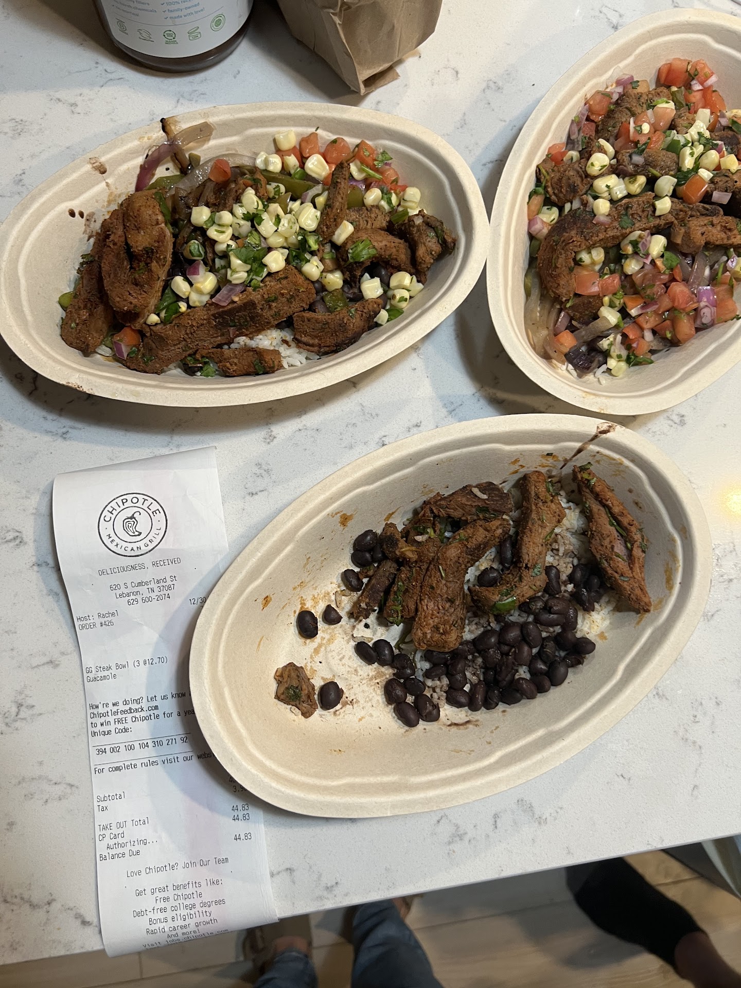 The staff was nice enough. I ordered a bowl. I got rice, no beans, and chicken. Unfortunately, they were out of grilled veggies. I asked if they were totally out, and I got a shrug. So I guess they were. I also got guacamole because I had the promotion tied to my account of free guac. My husband got a burrito, and we each got drinks. I scanned my account and told them about the free guacamole.