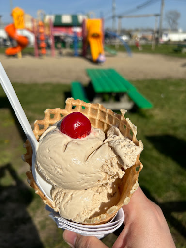 Read moreFantastic pit stop for little kids. We got delicious hand-dipped ice cream and hot ham & cheese sandwiches. The mint ice cream was particularly good, and the staffers were friendly and quick. There was a shaded pavilion as well as lots of picnic tables on grass, with pea gravel under the playground structure. It has several nice small slides, and 6 baby/toddler swings as well as 6 regular swings. The tall big kids structure only has ladders to get to it, so stair-climbing toddlers can’t sneak up there. It is right off the highway, which was awesome. There is a wooden fence between the playground and busy road, which was enough to keep my child away from danger, but a more adventurous kid might be able to climb through it. (The only suggestions would be to upgrade to a picket fence, and plant fast-growing trees or rig up some of those playground tarp things for shade). We were SO thrilled to discover this place and will be back on our next road trip...