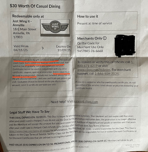 Read moreVery unprofessional business. Will never go there again! So my wife placed an order for 4 dozen wings and fries last Monday at 5:30p and picked them up a little after 6. Finally got home and sat down to eat them about 6:45/7 and noticed her order and my daughters were very dry and crunchy, mind you we just paid $50 for our order. I was coming home from the Duncannon area and it was snowing bad so I arrived home later. She awaited my arrival (9:15) to see if my consensus was the same before calling because with the snow she wasn’t looking to go back out anyway. I tried mine (mild and garlic parm) and they also were very dry. I tried calling in at 10:08 and no answer. I called the next day and realized they close on Tuesdays so I reached out on fb and the owner messaged me. I spoke of the issues and being unhappy and the owner offered 1 set free and 25% off. I mentioned that I had 4 dozen (even had a picture I took of the poor quality) that had issues and repeatedly gave the owner a chance to rectify the situation to the point that he just ghosted me and left me on “read”, not before belittling me for my wife not going back right away or us not eating them right away. I finally went in today to accept my small concession and the manager kept asking to see the messages several times, wanted to “write down” my card number for Annville to run it and couldn’t provide a receipt of any time. These people have very bad business practices and no customer resolution. Also, don’t follow their hours on google, they go by the bus schedule to when they close. Eat elsewhere! Not a happy customer and I would’ve given them another chance too if they...