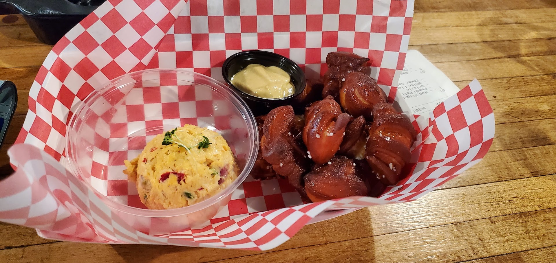 The pretzel bites and especially the cheese dip are amazing. The service was super fast and it was really easy to order.