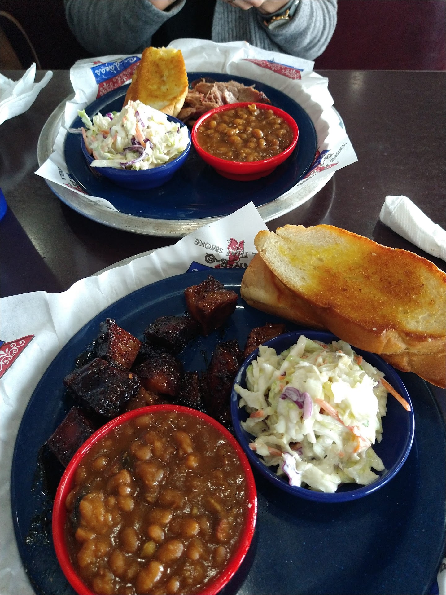 Read moreMixed reviews on this. Service was good. Quality of food was ok. Portion size, on the other hand, was a mixed bag. If you are ordering a Budget Buster meal, the portion size is good. If you order a lunch platter, not a good deal at all. My wife ordered a Budget Buster meal (pork) for lunch for $7.49. Because Burnt Ends wasn't on the Budget Buster menu, I ordered them from the lunch Platter menu for $14.99. (For comparison's sake, the Pork lunch platter is $10.59.) As you can see from the picture, the slaw and baked beans portions are identical, the meat portions are roughly the same size, the only difference is that the platter comes with 2 pieces of garlic bread instead of 1. That is a difference of $7.50 for an extra piece of garlic bread! ($3.10 if you compare pork with pork.) If the burnt ends had been awesome (they were so-so), or if the portion size would have been bigger, then maybe the price difference could be justified, but as it is I walked away with distinct sense of being let down. Moral of the story? Order from the Budget Buster menu! The Platter menu isn't worth it unless you like expensive...