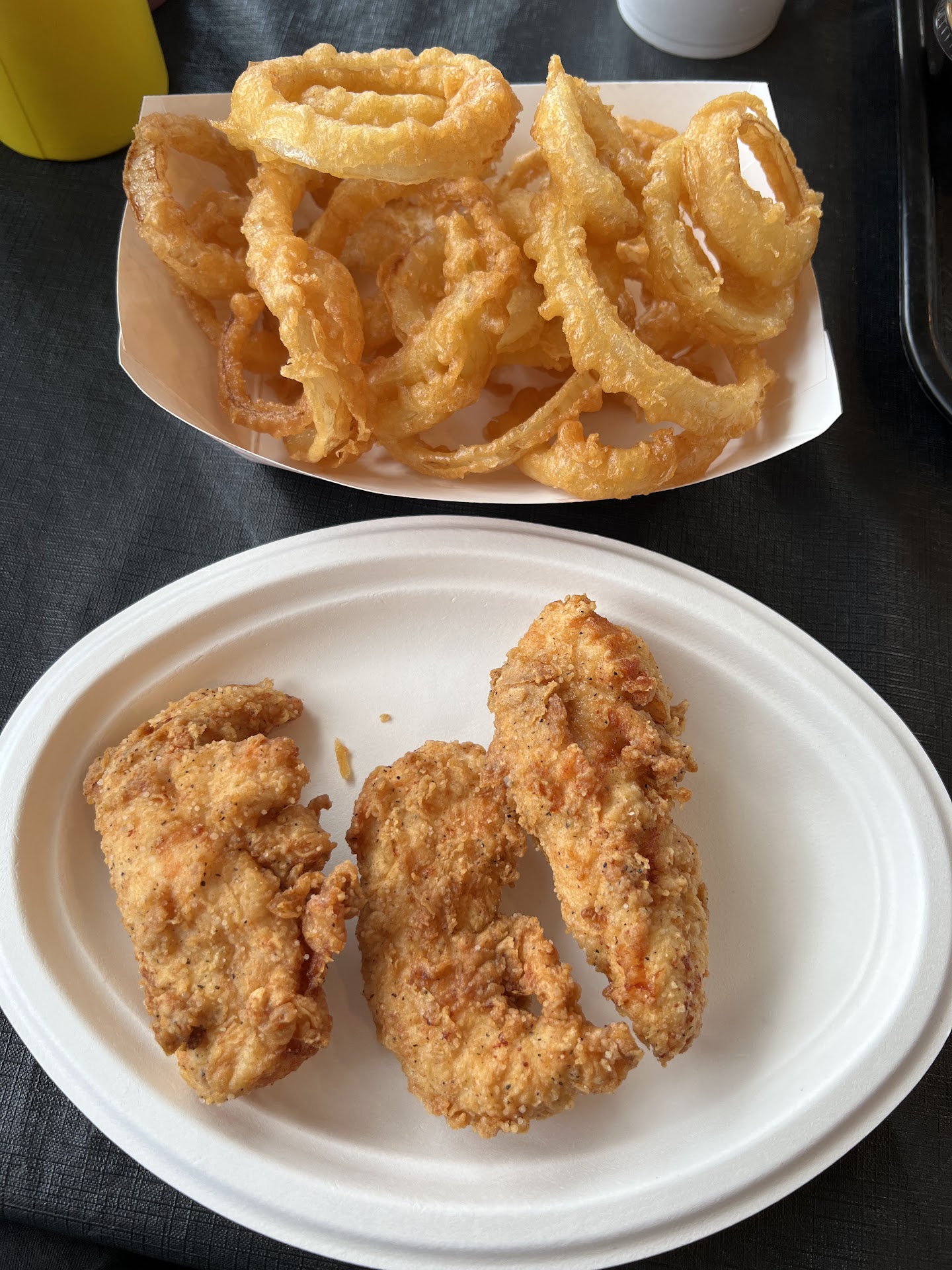 Three tenderloins(breaded) and chicken fingers for the mains. Then we get mushrooms, fried zucchini, onion rings, loaded taco tots, and mozzarella cheese sticks for the sides. First off I didnāt try the tenderloin but they all said it was good. I did however have the chicken tenders. Man weāre they fresh, hot, and juicy. The seasoning/breading was so good. They also has good bbq sauce. I ordered the 3 pack and wish I would have gotten more.