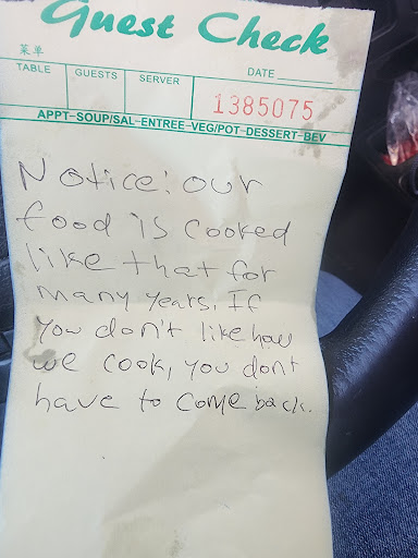 Read moreTo start, when we went in, the person seating us was getting ready to place us in the dining room then saw our three year old and decided to put us in the back dining room where he had to turn on the lights just to seat us. We were the only customers in the restaurant. He kept acting like we were inconveniences to him and repeated they were short-staffed. Again, we were the only customers. The server didn't bring a water or tea cup for our daughter, so we had to use one of the tea cups for her that we poured our water into so she could have something to drink. The server wanted us to order as soon as we were seated and was annoyed when we asked for a couple minutes to look at the menu. We placed our orders, 3/4 came out incorrect. When I asked to have our daughter's Chow Mein be corrected to the noodles the server scolded me for not telling him upon ordering. I, literally, ordered fried shrimp and Chow Mein for her, they gave her chop suey. Then charged me extra for asking for it to be corrected. The two incorrect adult meals were just dealt with since the server was so rude. My husband's Pork Foo Young was inedible, the gravy was extremely gritty. The fried shrimp was so greasy it overpowered the taste of the shrimp. If I could give zero stars I would. This was our first and last time going to this establishment. I'm sure the owners are going to come on and berate me for my negative review as is their history with bad reviews. Obviously they don't care about their customer satisfaction or their...