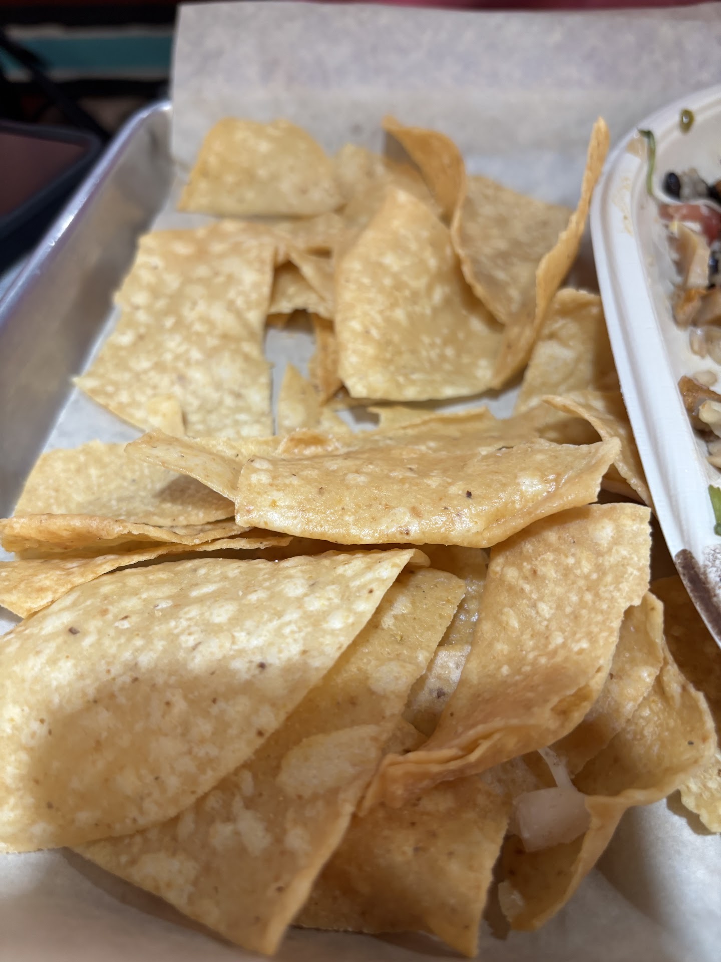 The corn chips they gave each of us were, thankfully, not salted. Sadly, however, although I tried 4 of their 5 sauces, I did not find one that I liked. In fact, the chunky one tasted like it was Pace Picante Sauce, which I dislike. I didn't try any sides and drank only water.
