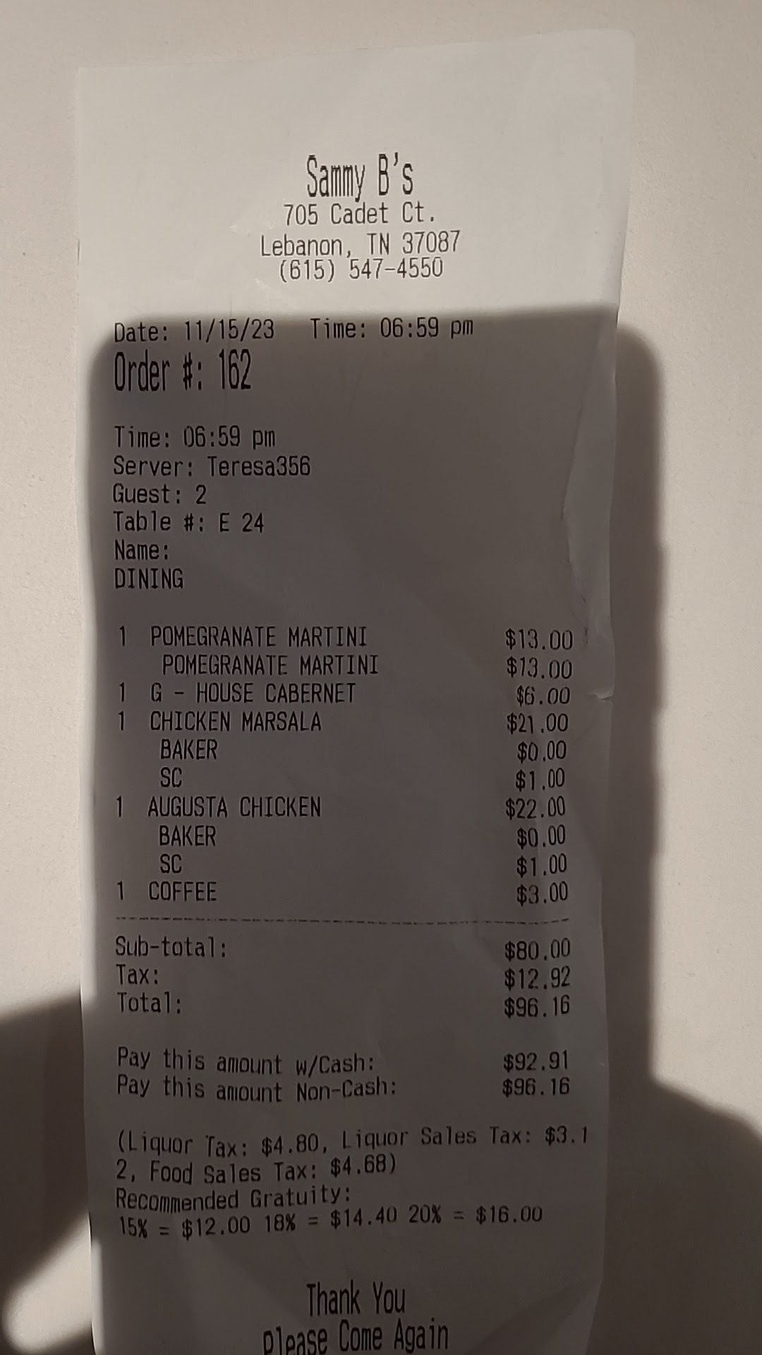 My spouse is an amputee, an above the knee amputee so it makes it very difficult for him to walk. With Sammy B’s there’s only one handicap parking spot in the front, and the rest are in the back. The worst thing about the ones in the back is that you have to walk a slight incline for the entire length of the restaurant to get to the front door. This is a struggle bus ticket for the mobility challenged and I’m surprised no one has told you, we don’t want that ticket-we just want a smoother ride to the front door. Sammy B’s, I highly suggest that you take those parking spaces that are adjacent to the patio that we jealously walked past and make those into handicapped parking spaces. This will show that you take those with mobility issues into account and not turn parking into a sweepstakes that very few will win.