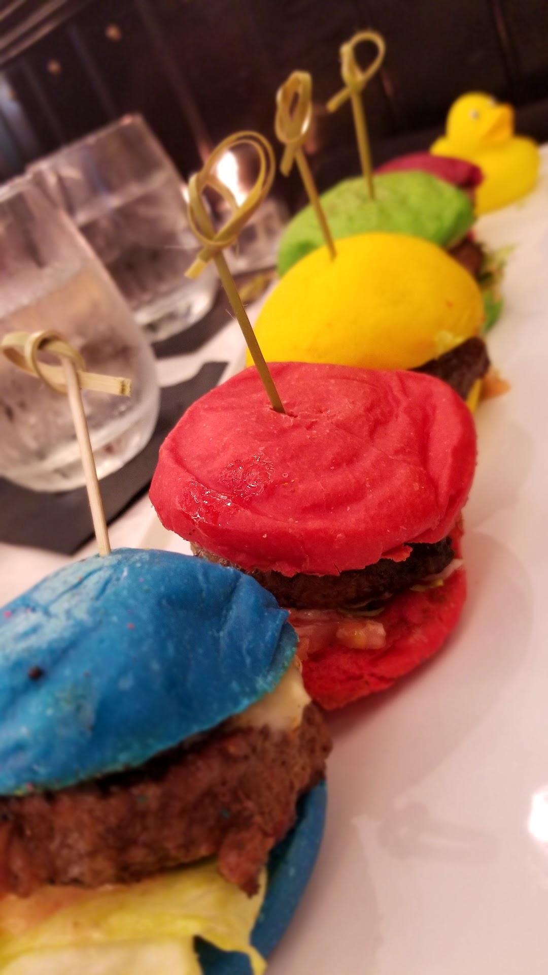 The food arrived in a decent amount of time for a busy Saturday Night and my new friends (our table neighbors) quickly asked if they could get a pic of my sliders, of course I obliged because who gets mini Cheeseburgers in bright colors and doesn't expect people to get excited? Not only were they pretty, they tasted amazing. Perfectly cooked and very fresh. The "side" of fries was HUGE, I'm not a big fan of shoestring/skinny fries so they didn't really make the meal for me, but they were crispy and well cooked so I can't complain. My guy's burger was perfectly cooked to his specifications and he really enjoyed it (not that I was paying attention as I fawned over my colorful dish) my sliders also came with a Rubber Ducky....yes it came with a toy like a grown up "kids meal", I was beyond delighted.