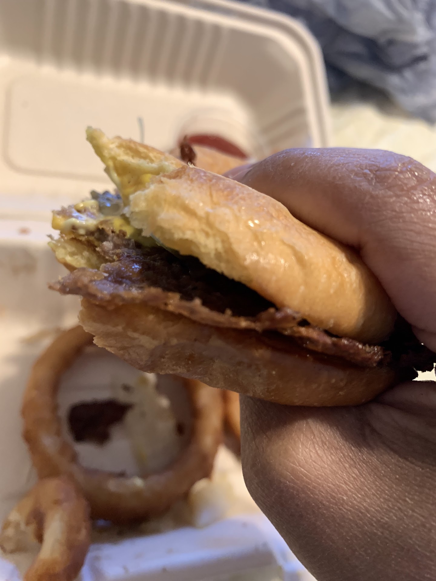 So sometimes life be truly lifin' and right after leaving the establishment we stopped at a gas station. While there my husband's truck began to overheat and we had to wait on our son to pick us up. Lawd have mercy š„ŗ. Well it was freezing cold and I immediately grabbed that hot food and devoured it. The burger meat and bacon was cooked and seasoned to utter perfection. The cheese was just oozing and the bun was soft with a nice buttery toast to it. The onion rings were EVERYTHING, fried to perfection with a nice crispy batter around them. Oh man! I was in love. Now we didn't get to savor the food in the best circumstances but it was AMAZING and because of this and just that the food and service was just that damn excellent we will be returning.
