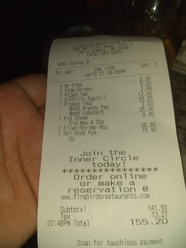 Read moreI gave the Lee's Summit location a 2 out of 5 stars because of the taste of the food and overall experience at this location and with their headquarters. First off, the food tasted great, so that is why I gave it 2 stars. Everything else about my experience is why I will not be returning to any location of Firebirds. Just to give you all details...I made a 8:30 pm appt and arrived around 8:05 pm. I was told right away I wouldn't get seated until 8:30 because they were busy. I said okay, and understood that. I and my daughter decided to wait inside because there was no one else waiting inside and I felt safe enough without the crowding. The rest of my party waited in their respective vehicles. About 5 minutes later I was told we have a table for you but don't think this will happen every time, we just happen to have an available table. I said I understand, great. Even though I felt as if they could have told me that 5 minutes ago when I walked in, if they had even looked. Still understood. We were finally seated and everyone got their orders in (6 of us). Everyone received their food except for me. My waiter who was good, asked if I had received my food about 5 minutes later. She said something happened to my food and it had to be recooked and the manager would be over. Still fine, I just started eating off my daughter's plate. Finally my food got to table about 10 minutes after everyone else's. It looked great. I took a small bite, the chicken was raw, so I sent food back intact, even with raw bite on plate. The manager finally came over. The first this she said was, "I cut the chicken open and it was not raw." I told her it was raw even though it looked cooked. There was no mention of a sorry your food came out late, the manager just challenged the fact that my food was raw. By this time everyone was done eating and I had eaten off of several people's plate so I didn't want my plate anymore. We had other plans so we left. My meal was taken off and I paid and tipped waiter well. I was very upset, but didn't want to ruin the evening. I decided to give headquarters a call later. Someone at headquarters said they would send me a gift certificate, but more important that the general manager should be giving me a call. I have not received a call from GM nor did I receive a gift certificate. I would have definitely have used at another location, because as I stated, the food was good. Very poor customer service at every level in this organization. I will not be back, the food was...